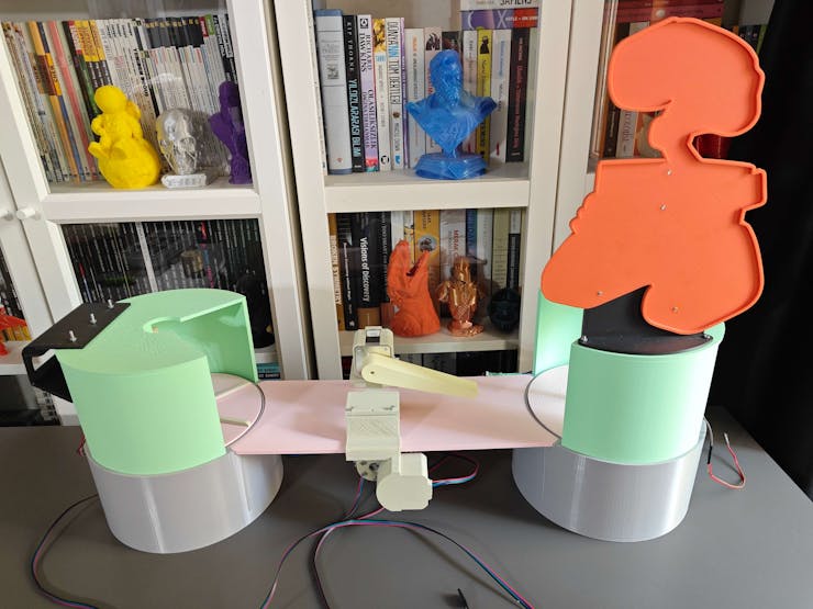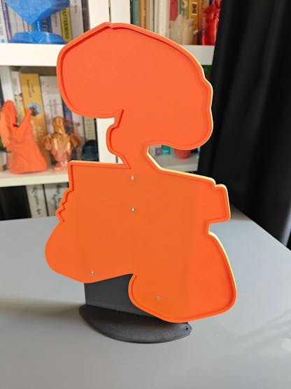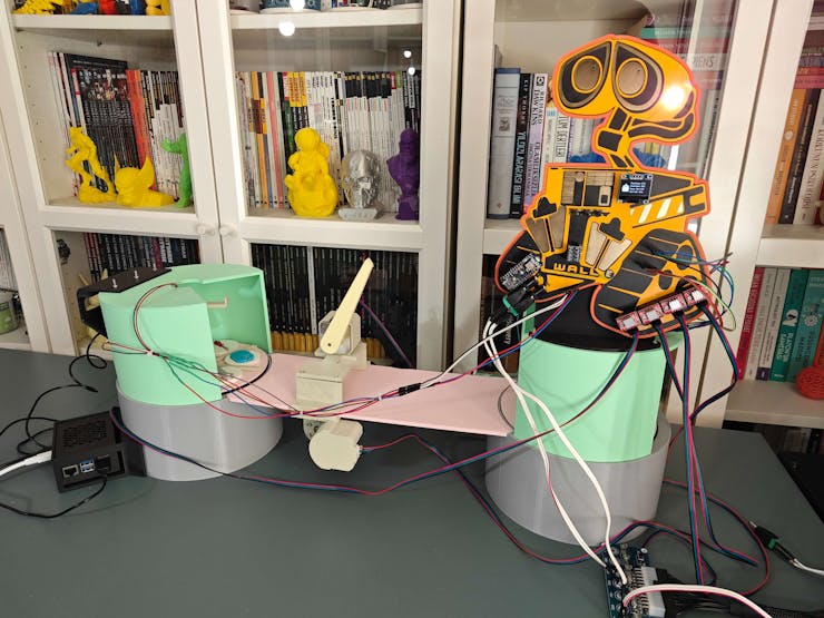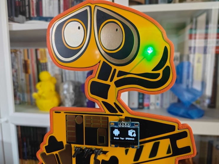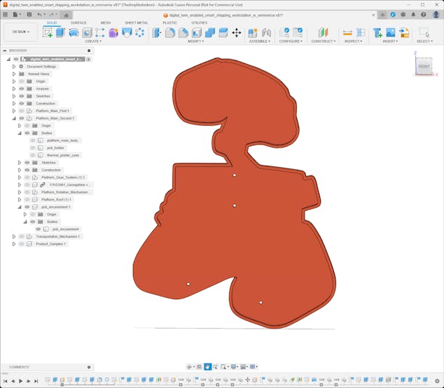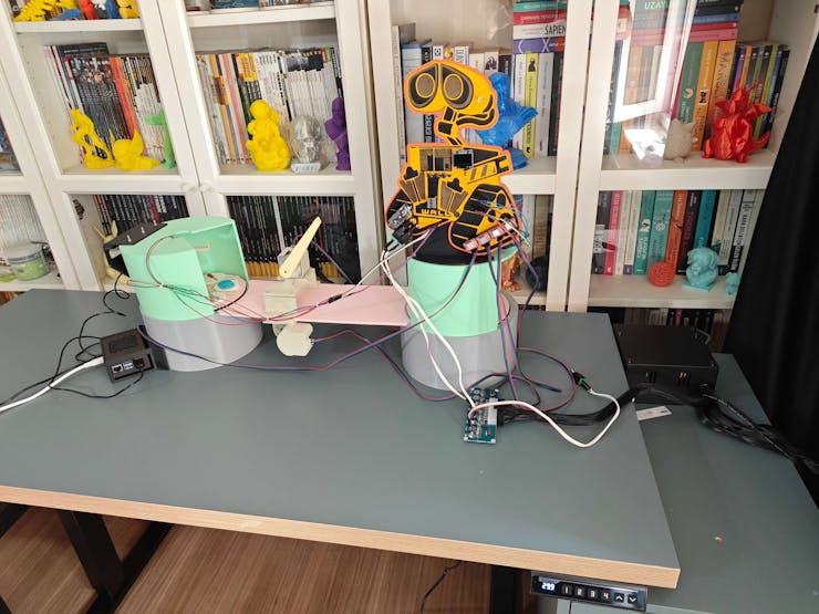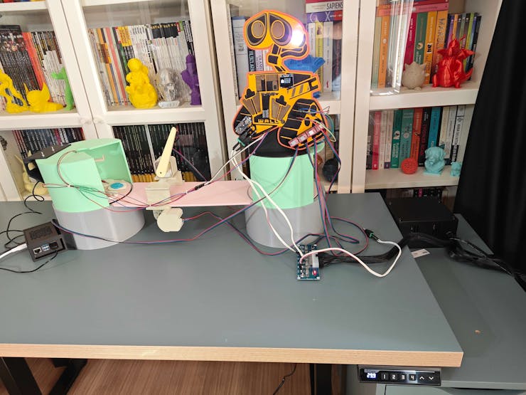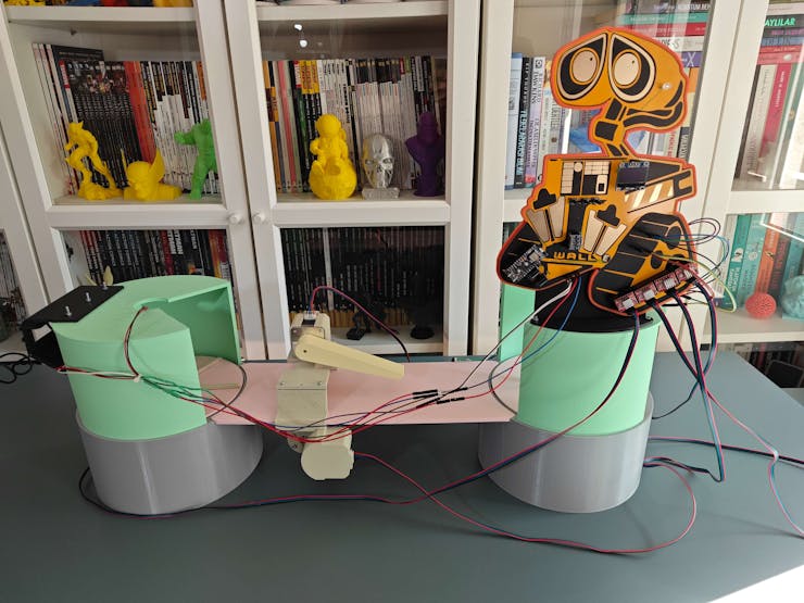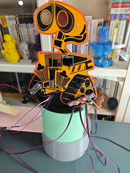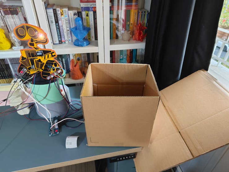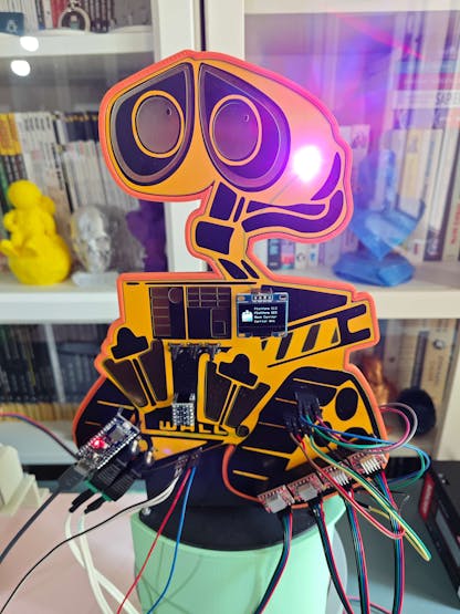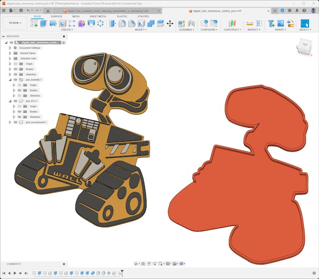 Since I needed to know the exact electronic components employed by the shipping workstation to create compatible 3D parts, I decided to prototype the mechanical device structure and design a unique PCB (inspired by Wall-E) based on Arduino Nano Matter as the workstation control panel. I designed the Wall-E PCB outline and encasement on Autodesk Fusion 360 to place the electronic components in relation to the PCB easily while designing the virtual shipping workstation.