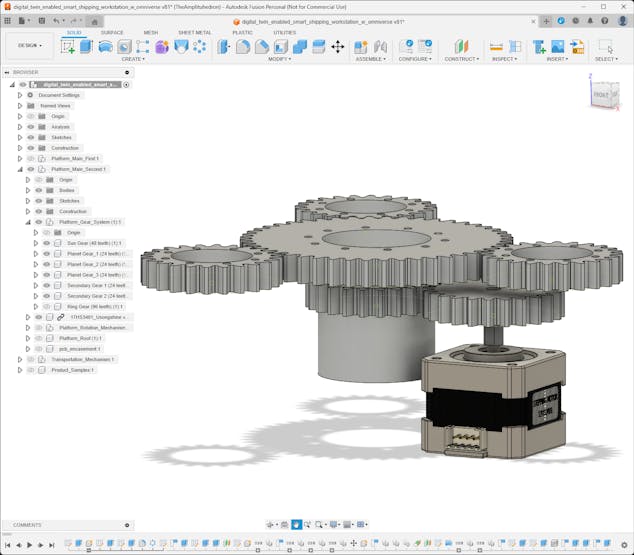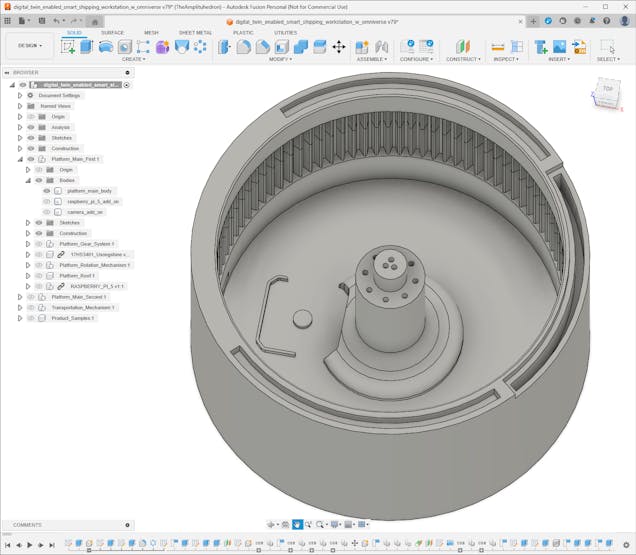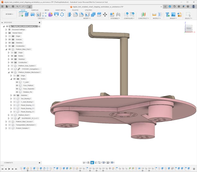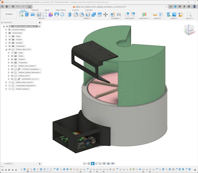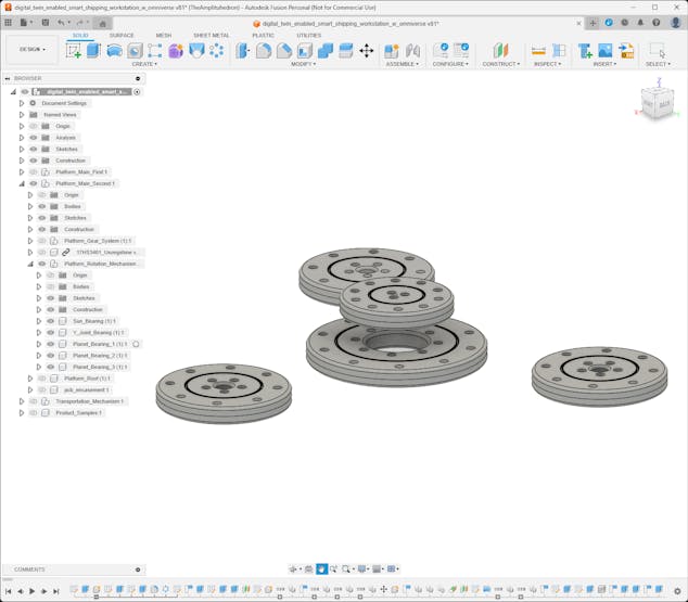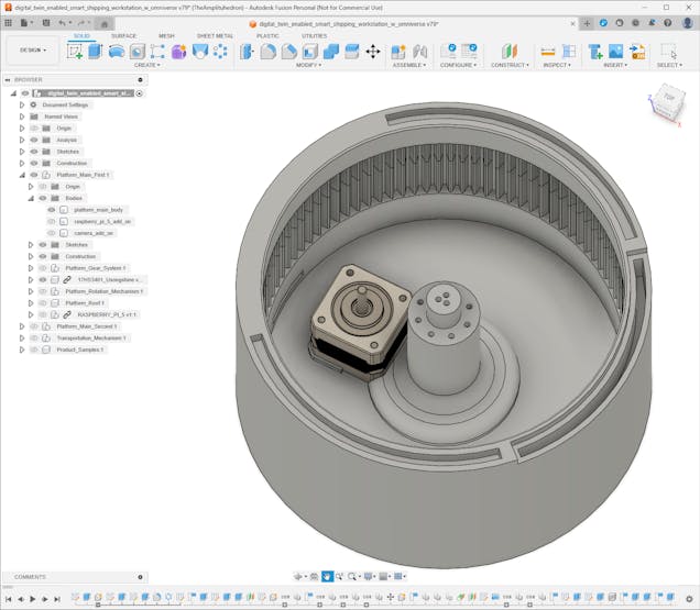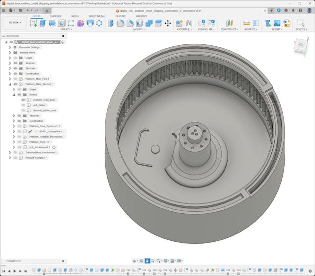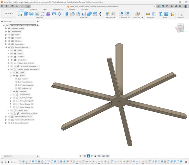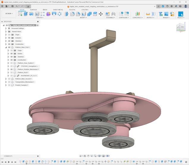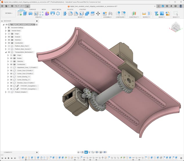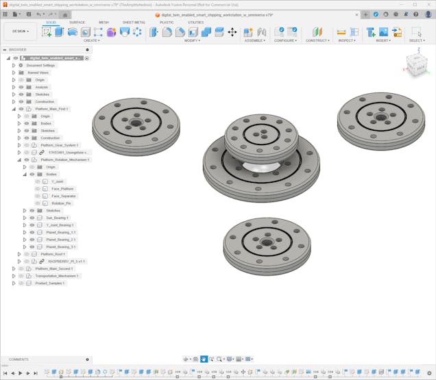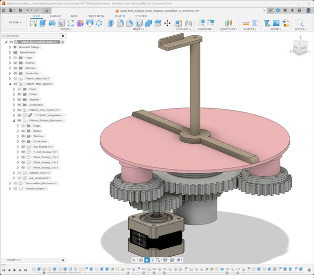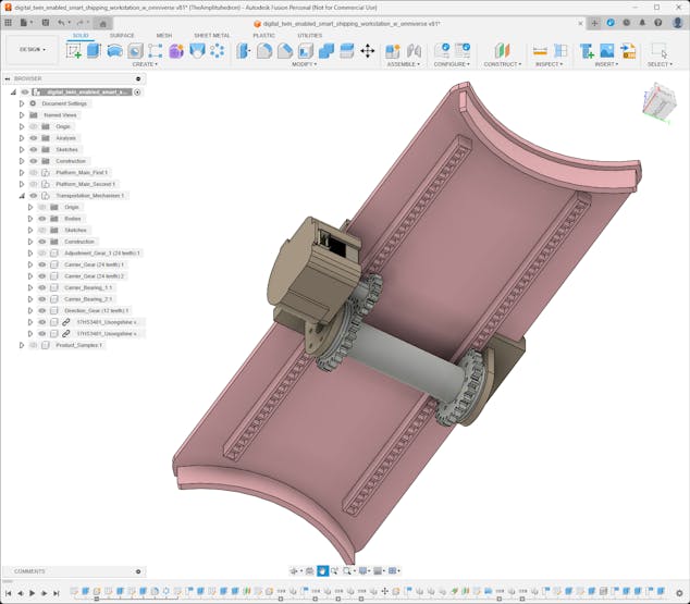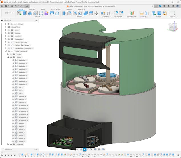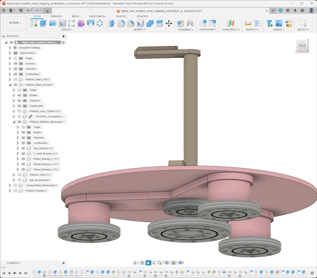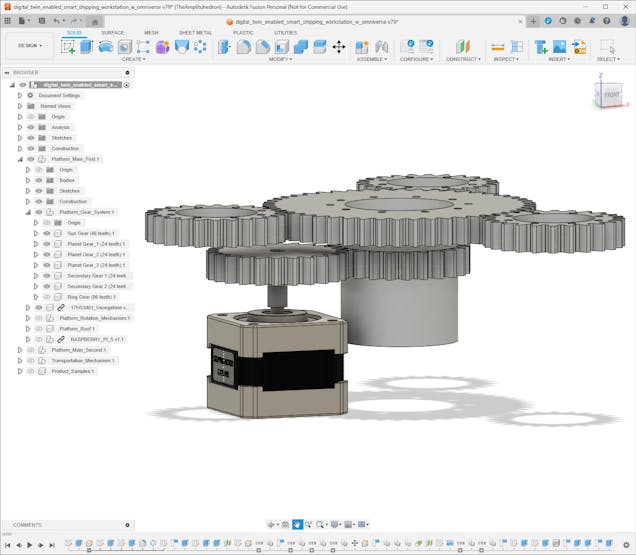 After testing electronic components and completing the PCB layout, I designed a plethora of 3D parts on Autodesk Fusion 360, including but not limited to custom bearings optimized for 5 mm steel balls, planetary gear mechanisms, and separated rotating platforms. After finalizing the required mechanical 3D parts, I exported the virtual shipping workstation as a single file in the OBJ format to produce an accurate virtual representation of the shipping workstation.