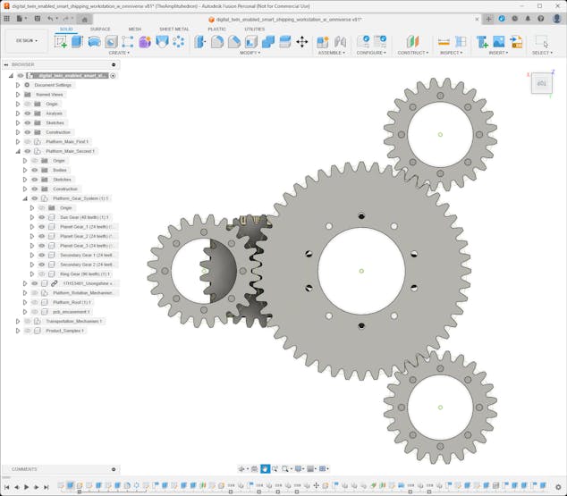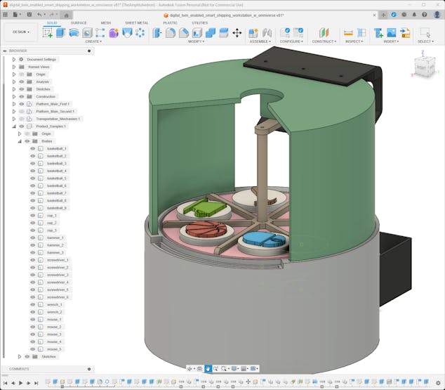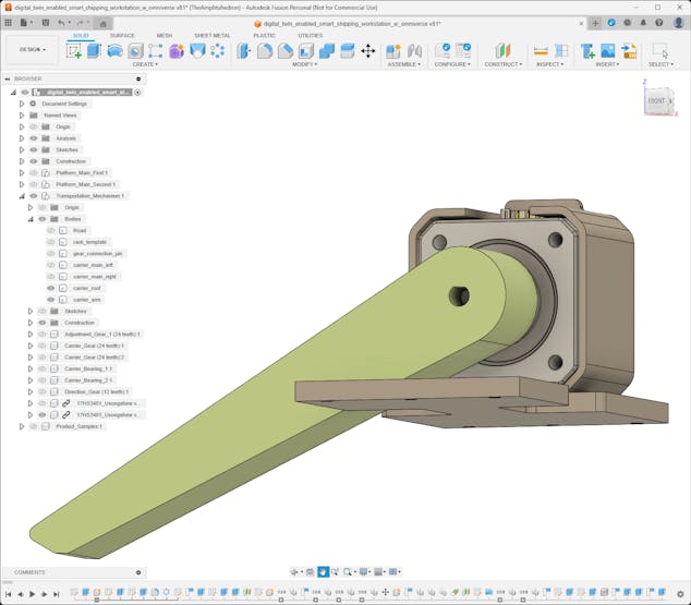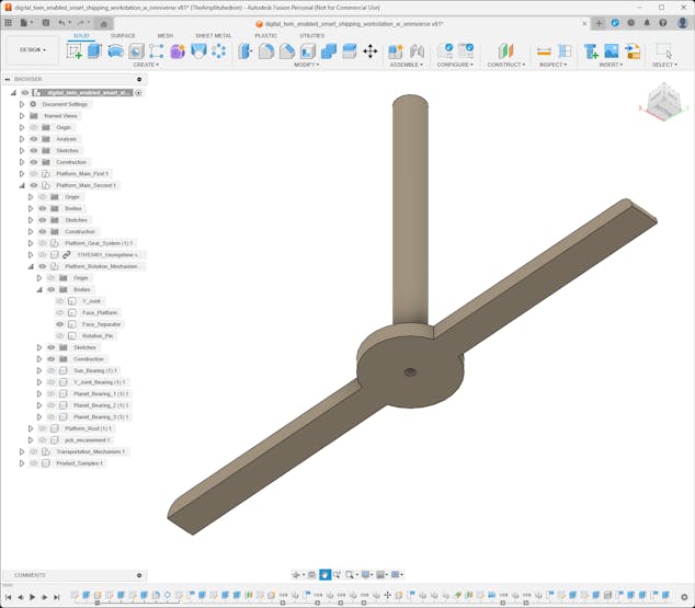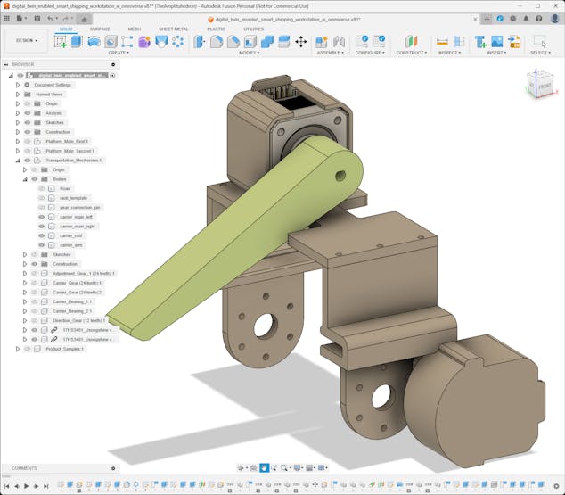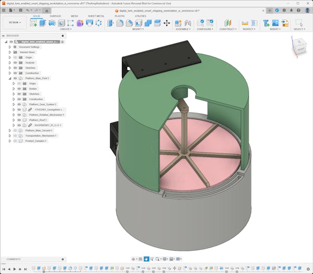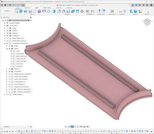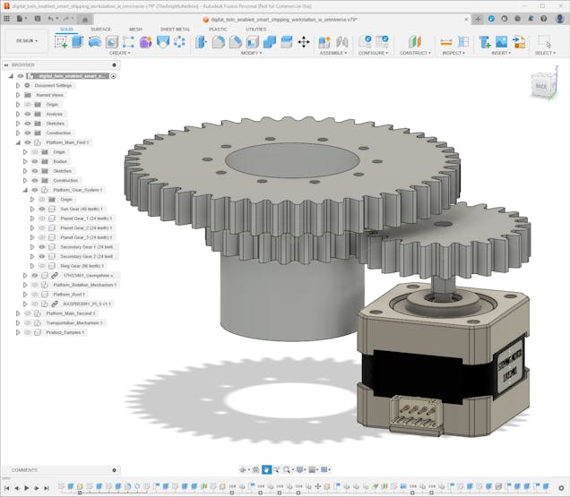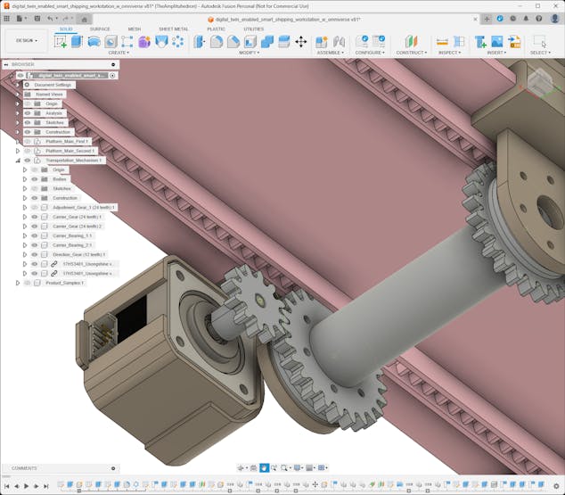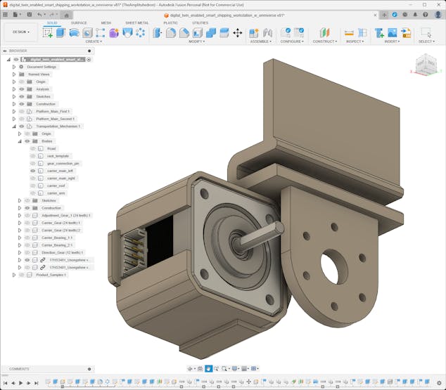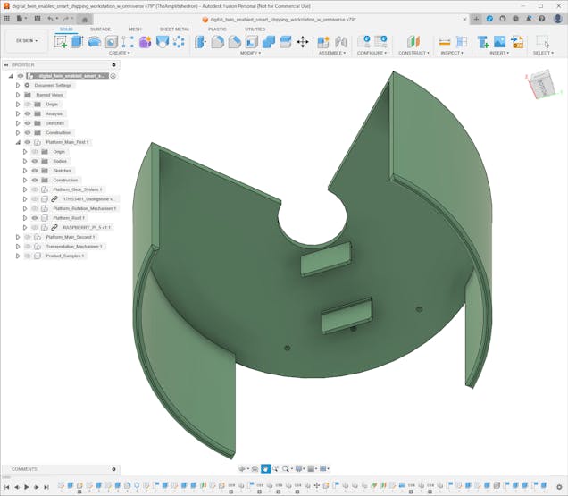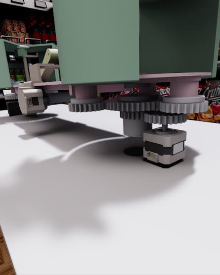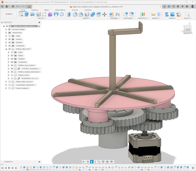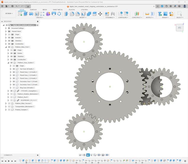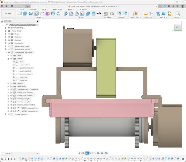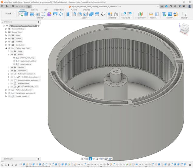 After testing electronic components and completing the PCB layout, I designed a plethora of 3D parts on Autodesk Fusion 360, including but not limited to custom bearings optimized for 5 mm steel balls, planetary gear mechanisms, and separated rotating platforms. After finalizing the required mechanical 3D parts, I exported the virtual shipping workstation as a single file in the OBJ format to produce an accurate virtual representation of the shipping workstation.