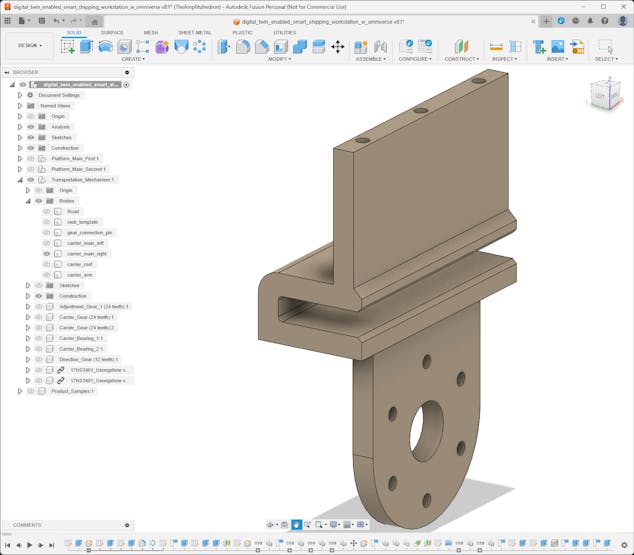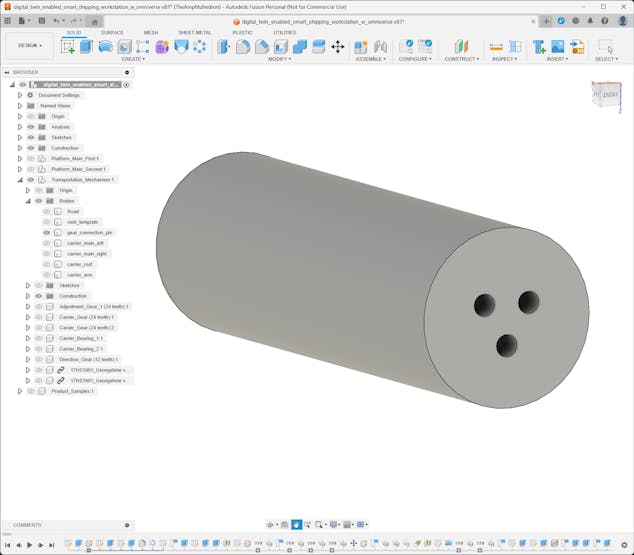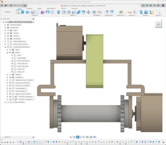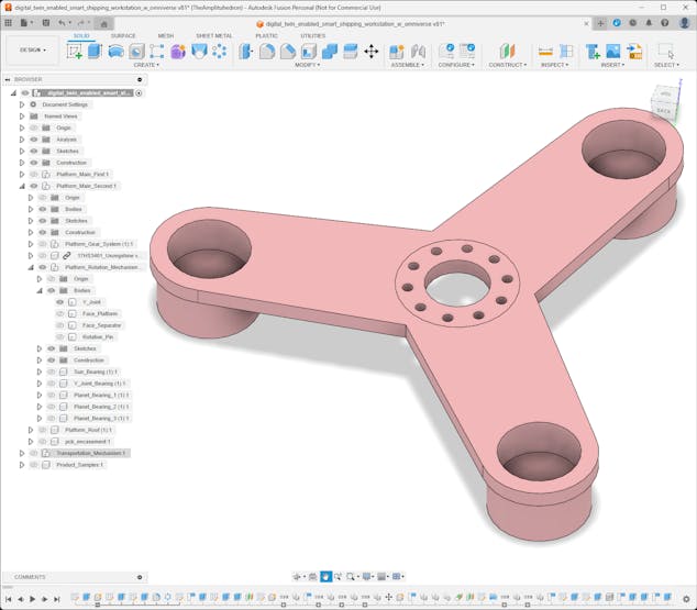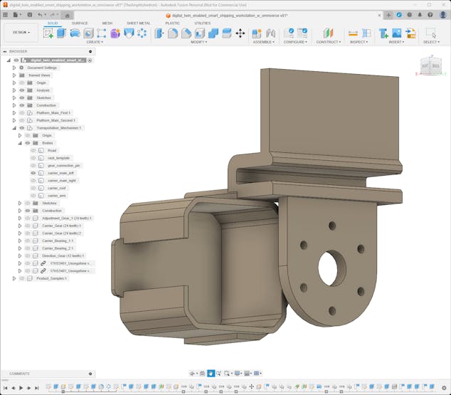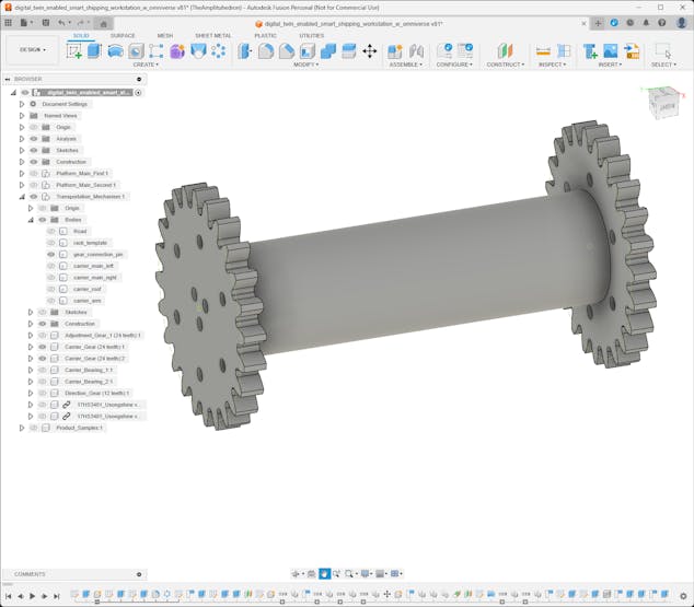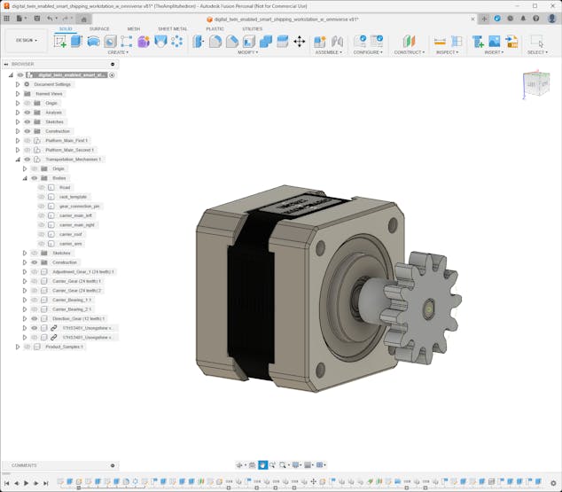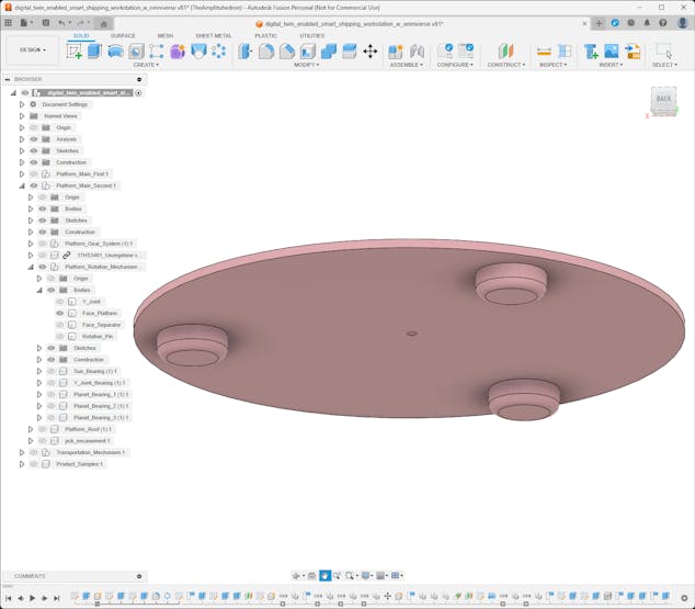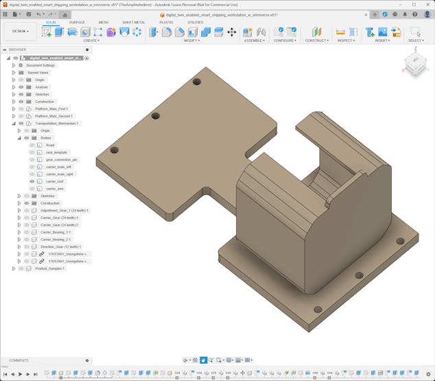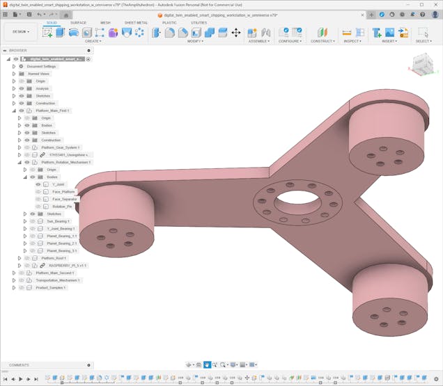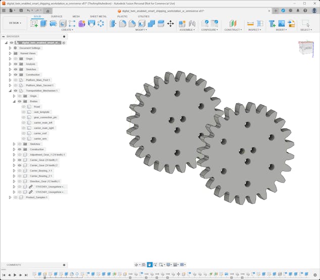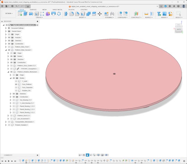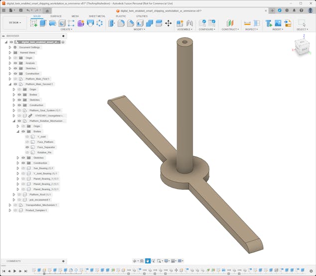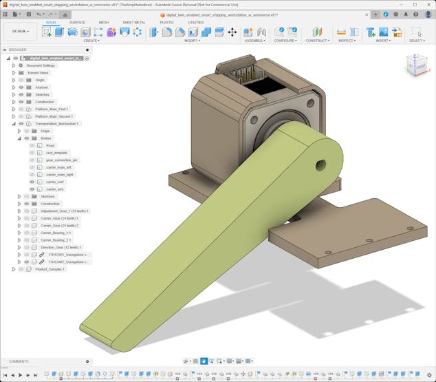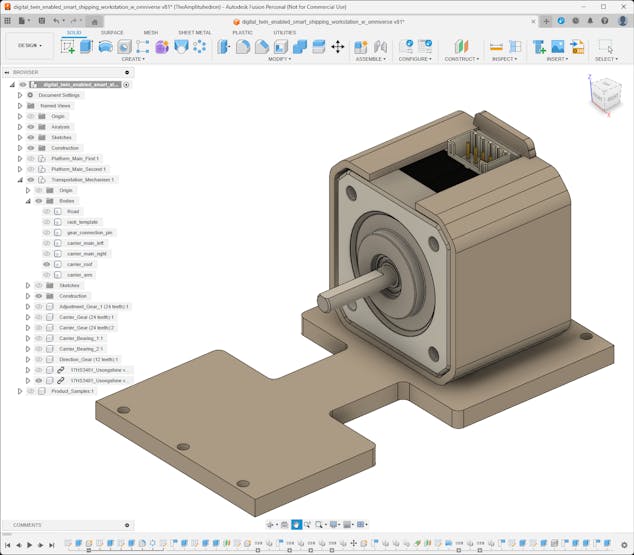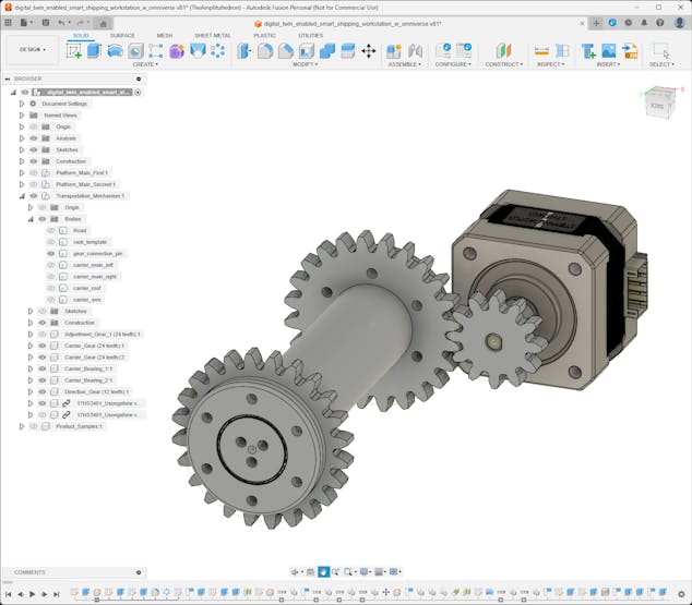 After testing electronic components and completing the PCB layout, I designed a plethora of 3D parts on Autodesk Fusion 360, including but not limited to custom bearings optimized for 5 mm steel balls, planetary gear mechanisms, and separated rotating platforms. After finalizing the required mechanical 3D parts, I exported the virtual shipping workstation as a single file in the OBJ format to produce an accurate virtual representation of the shipping workstation.