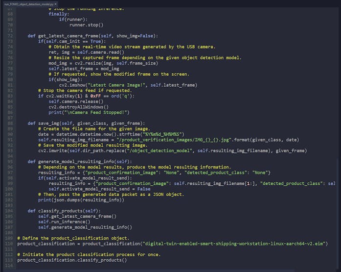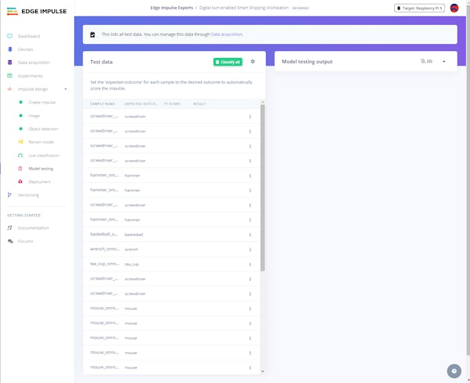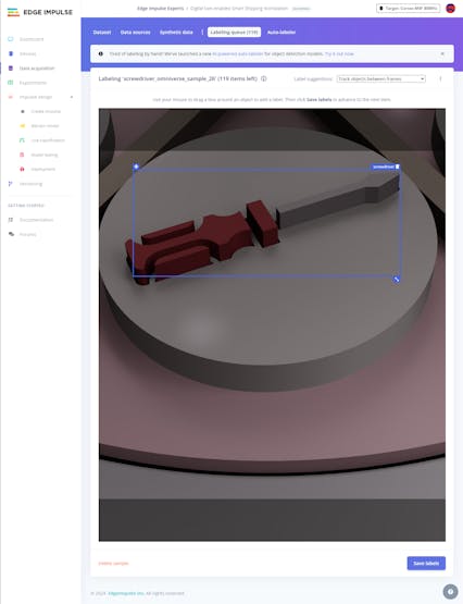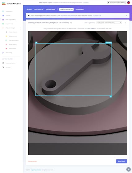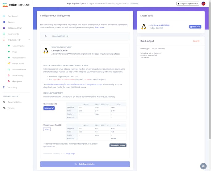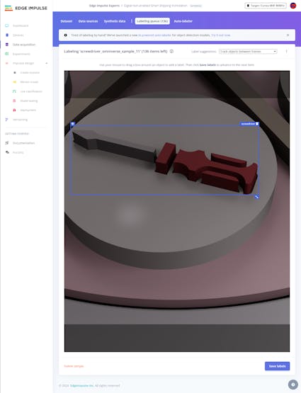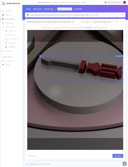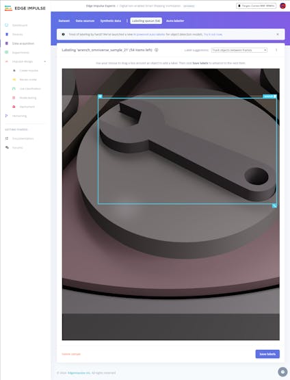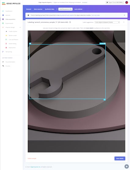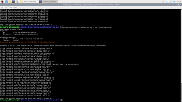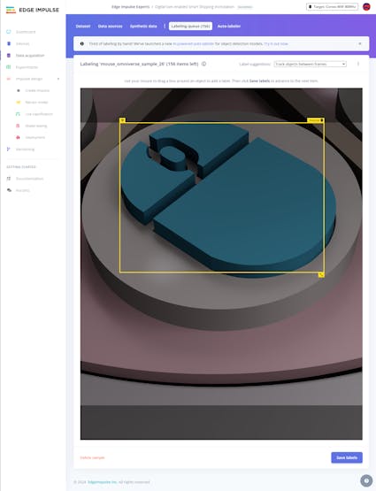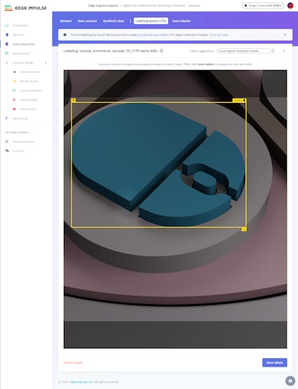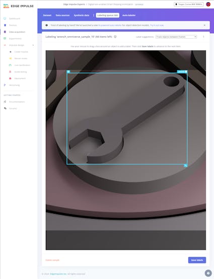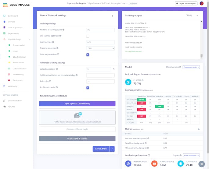 After employing built-in NVIDIA Omniverse features to construct my synthetic data set of customized sample products as instantiated by the shipping workstation digital twin, I uploaded the collected samples to Edge Impulse to train an advanced object detection model (FOMO) with synthetic product images. After validating and testing my FOMO model, I deployed it as a Linux (AARCH64) application (.eim) compatible with Raspberry Pi 5.