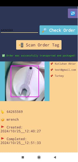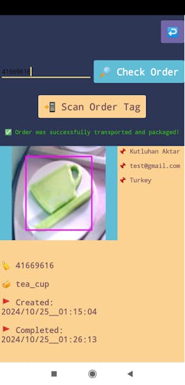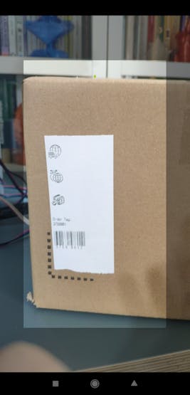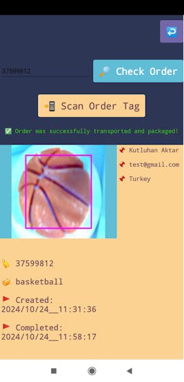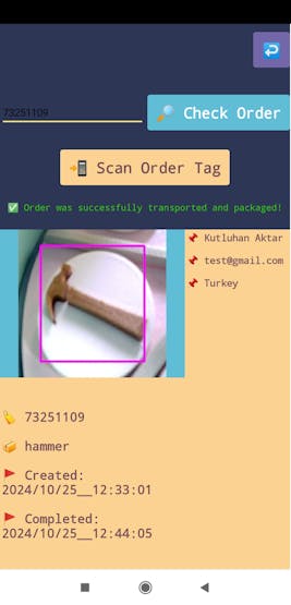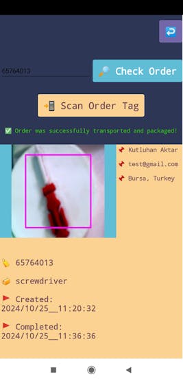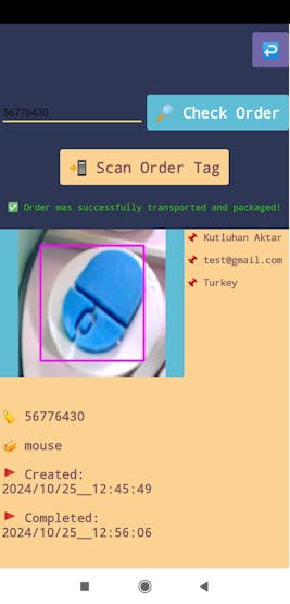 🚚📦📲 After scanning an order tag successfully, the mobile application enables the user to request detailed shipping information from the web application and review the associated model resulting image highlighting the ordered product via the modified bounding box.