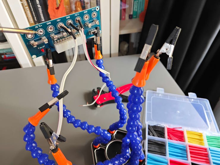 #️⃣ Since I needed to supply a lot of current-demanding electronic components with different operating voltages, I decided to convert my old ATX power supply unit (PSU) to a simple bench power supply by utilizing an ATX adapter board (XH-M229) providing stable 3.3V, 5V, and 12V. For each power output of the adapter board, I soldered wires via the soldering station to attach a DC-barrel-to-wire-jack (male) in order to create a production-ready bench power supply.