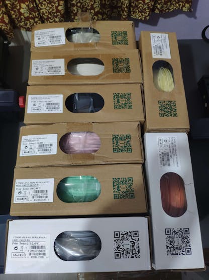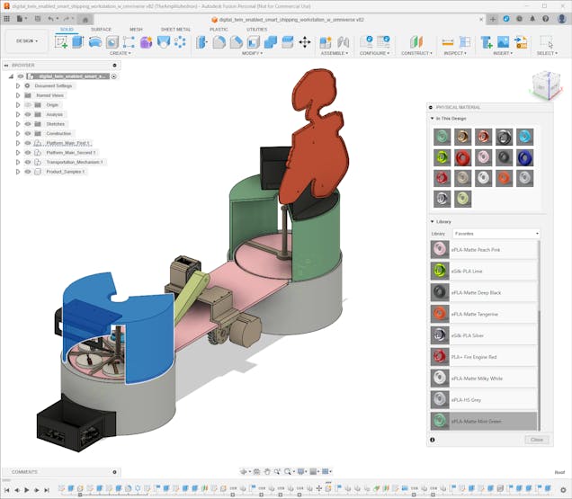 In accordance with my reverse digital twin approach, I had to envision each virtual shipping workstation 3D part appearance as close as possible to their real-world counterparts since I needed to construct a synthetic data set and train an object detection model even before printing these 3D parts. Therefore, while designing, I decided on the filaments I would utilize for each 3D part. Then, I searched for material type and color code for each filament to assign them to the corresponding 3D parts on Fusion 360.