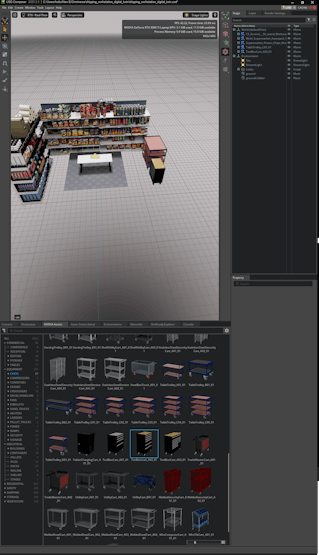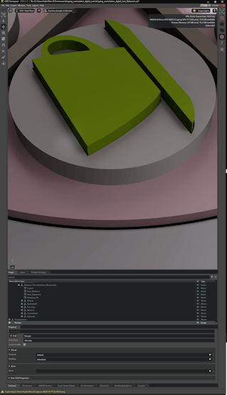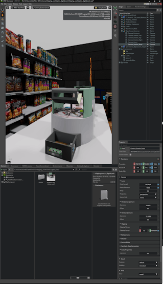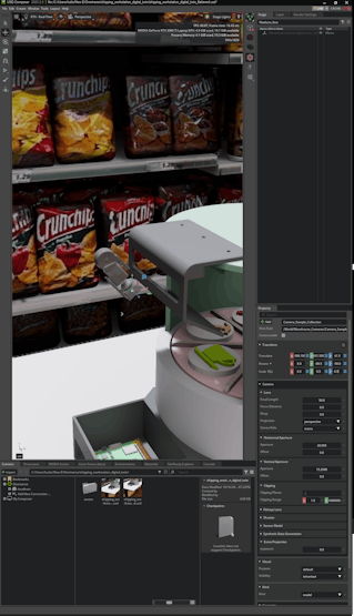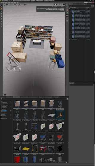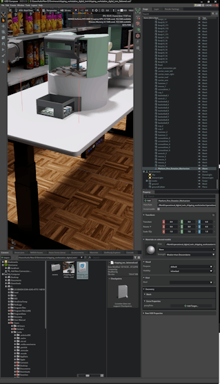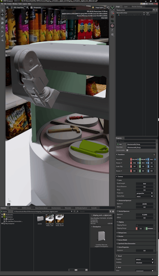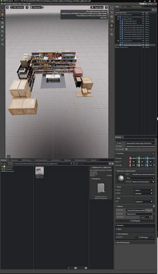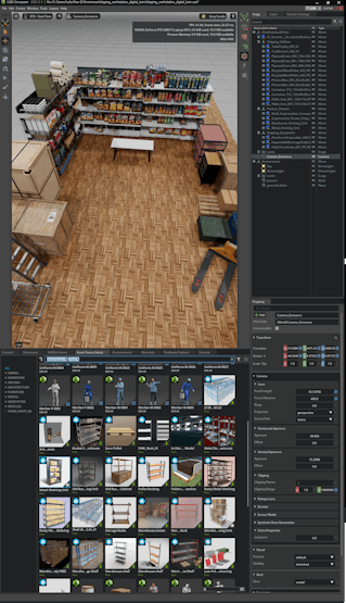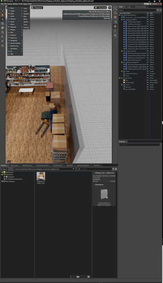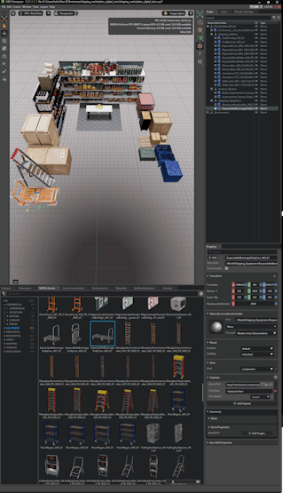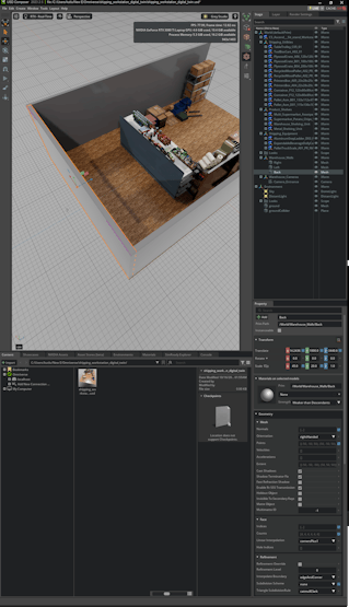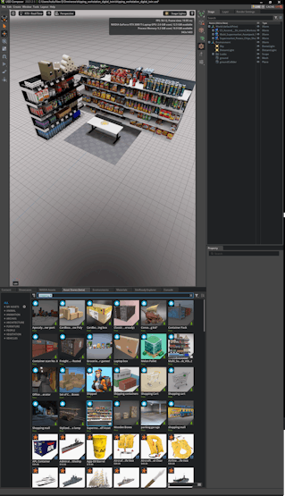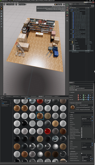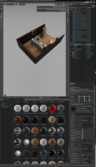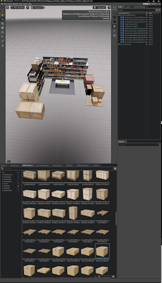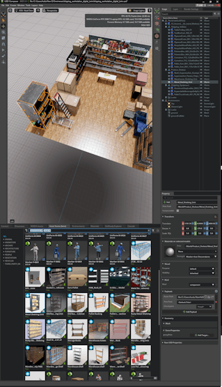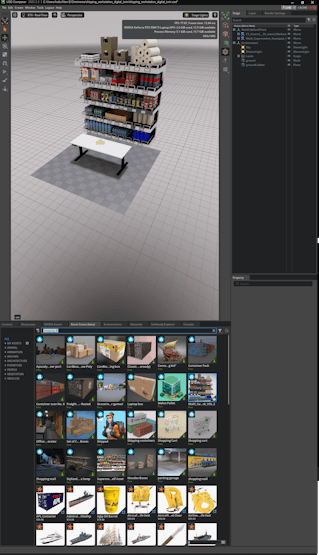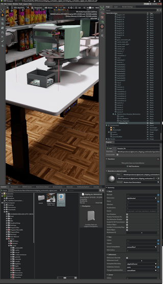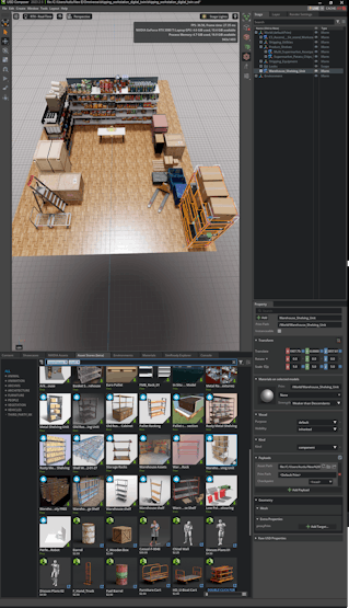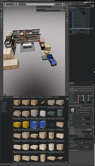 Then, I imported the virtual shipping workstation into the NVIDIA Omniverse USD Composer, which allows users to assemble, light, simulate, and render large-scale scenes for world-building. To generate a realistic scenery for shipping operations, I utilized some free 3D models provided by Omniverse and designed some additional assets. After completing my shipping warehouse scenery, I experimented with camera, material, and lighting configurations to render the virtual shipping workstation with exceptional quality and produce a precise digital twin.