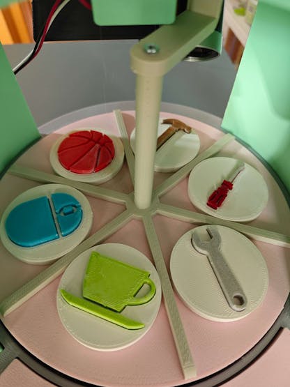 🚚📦📲 If the FOMO object detection model cannot find the ordered product, the web application dictates the mobile application to communicate with the workstation control panel so as to change the first rotating platform position to place the succeeding sample product under the USB webcam.