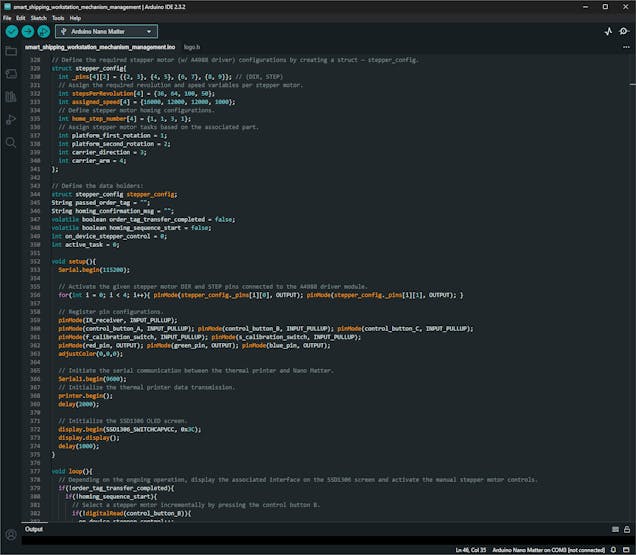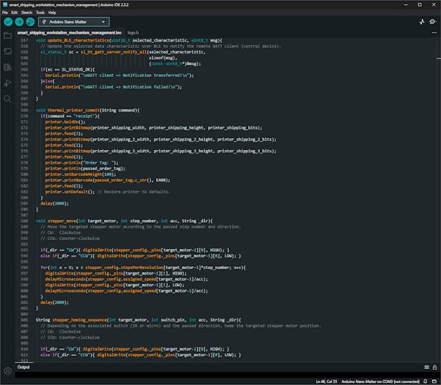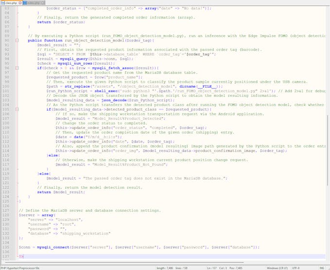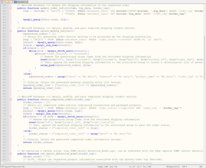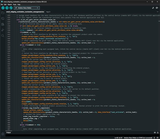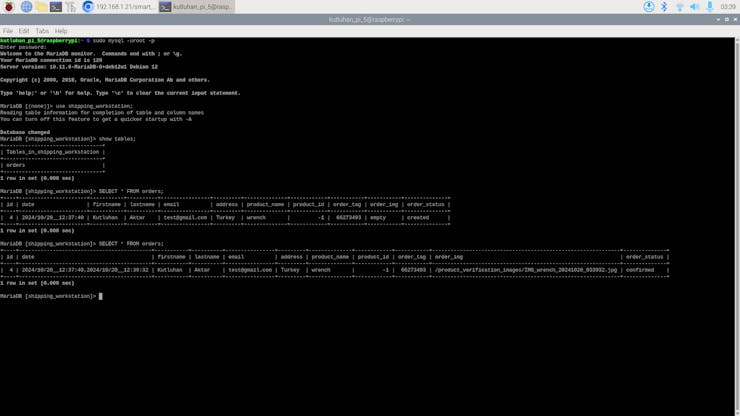 To create a fully functioning smart shipping workstation with state-of-the-art features, I developed a web application from scratch to manage the MariaDB database server hosted by Raspberry Pi 5, run the Edge Impulse FOMO object detection model, and transfer the detection results with the modified model resulting images. I also developed a mobile application (Android) operating as the workstation interface and the proxy between the workstation control panel (based on Arduino Nano Matter) and the web application.
