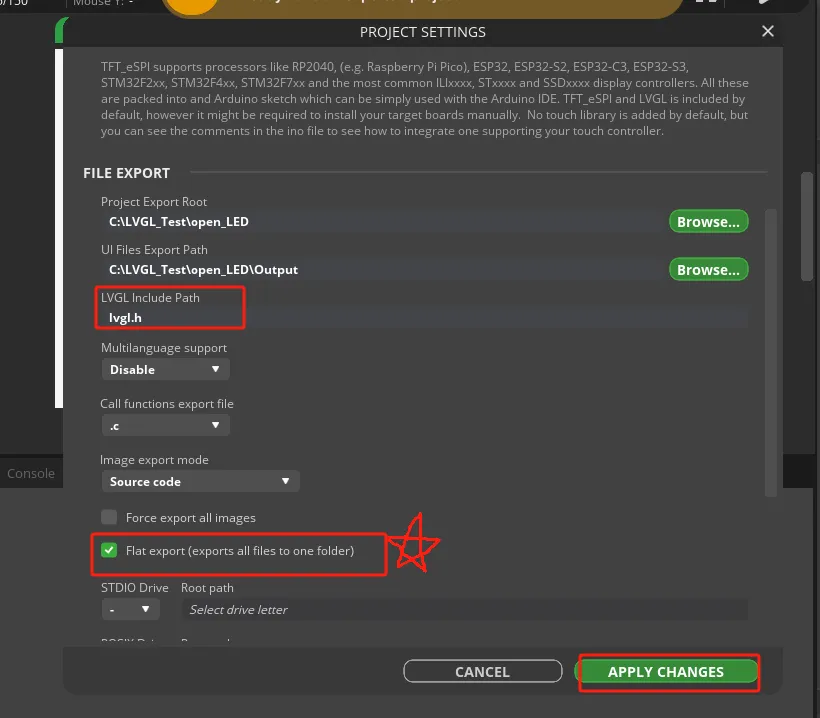 When select the Arduino framwork, there's only one option "Arduino with TFT_eSPI". By choosing this, the squareline studio will generate a template code suitable for the TFT_eSPI library. However, squareline studio not only supports the TFT_eSPI library, it supports a variety of libraries to suit different hardware and application needs. For example, Adafruit_GFX library, LovyanGFX etc.¶