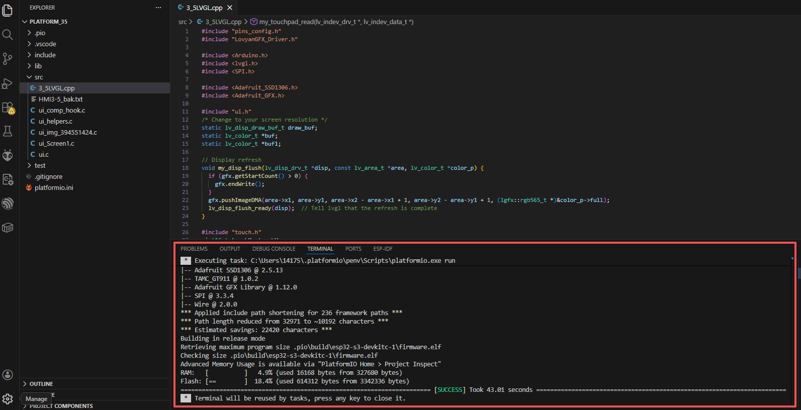 Place the lv_conf.h we provide to the path: .pio\libdeps\esp32-s3-devkitc-1-myboard in the project folder.