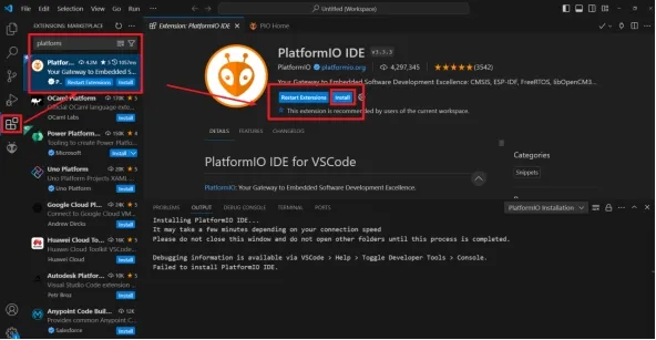 Search for 'PlatformIO' and install.