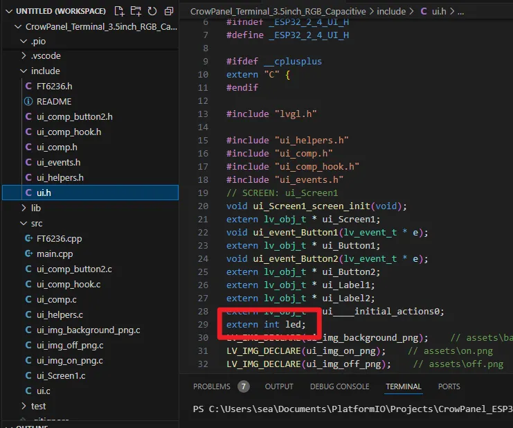 We need to add the UI file (generated from SquareLine Studio) to the PlatformIO project.