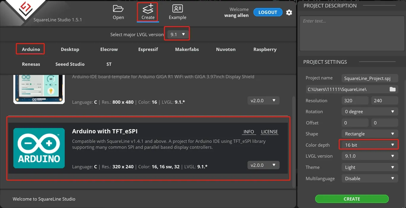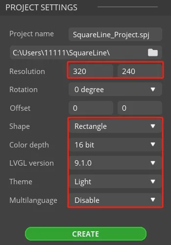 Set the name of the project, set the screen resolution to 320*240, set the color depth to 16bit, and keep other default settings. After setting, click CREATE to create the project.