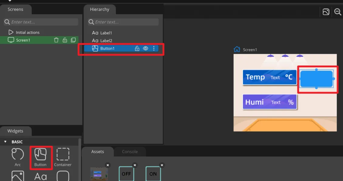 Click "Button" in the "Widgets" area, and "Button1" will be added to the current Screen.