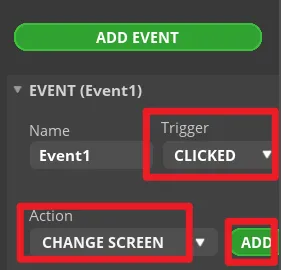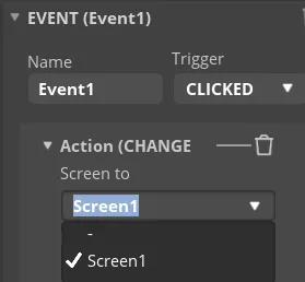Complete the event. Here I choose to change the screen, and the screen to be switched is Screen1.