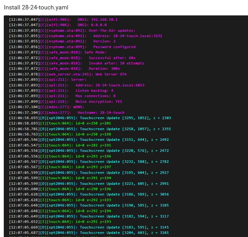 Connect the Crowpanel Miner ESP32 HMI Display to the computer. After running this code, you will be able to see the following information in the log window: