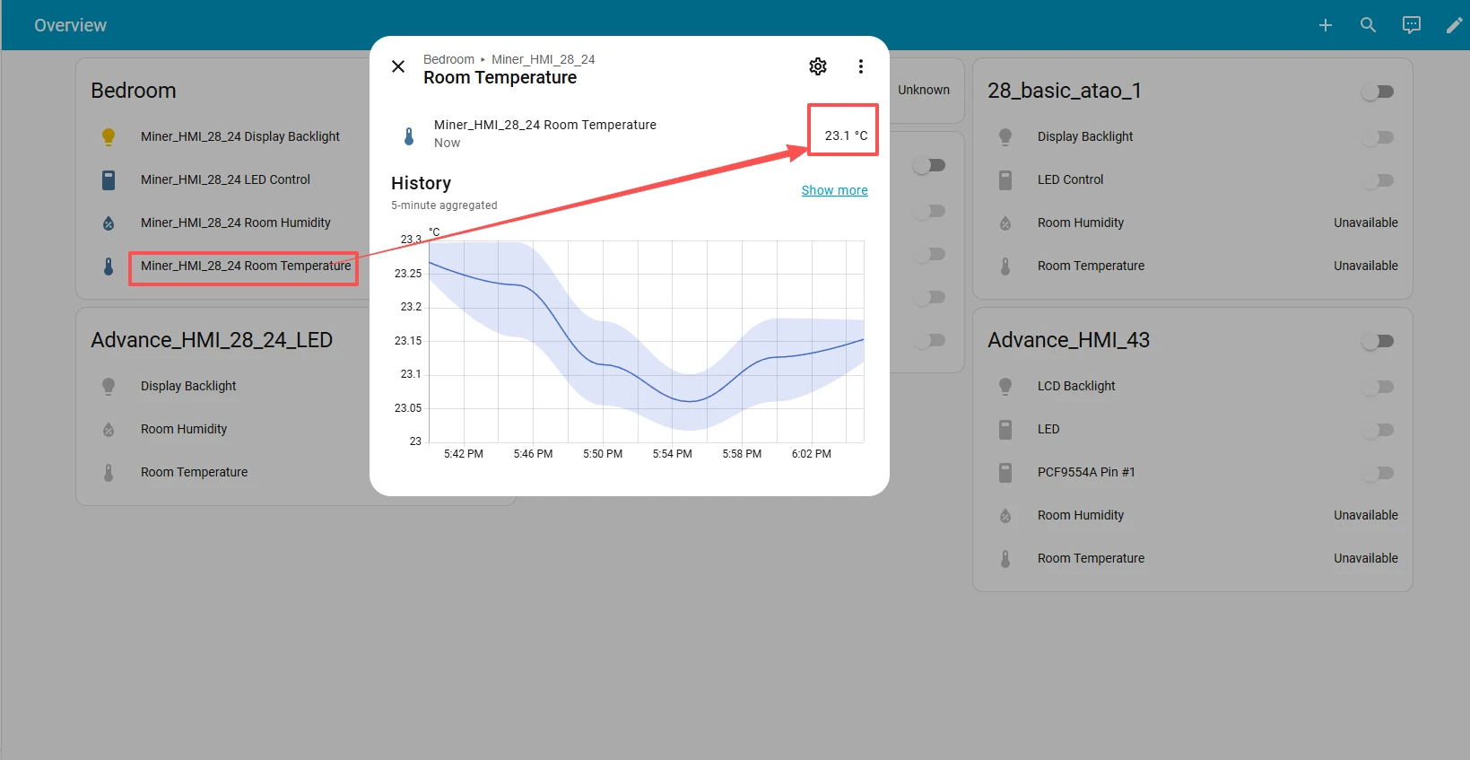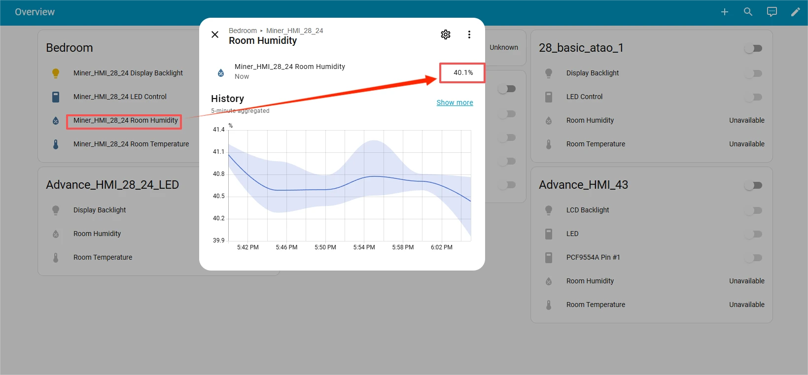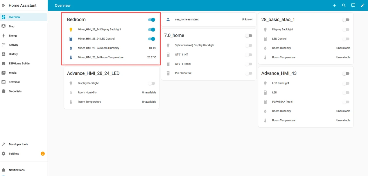 Next, let's take a look at the temperature and humidity data observed on ESPHome and the status control of the LED lights.