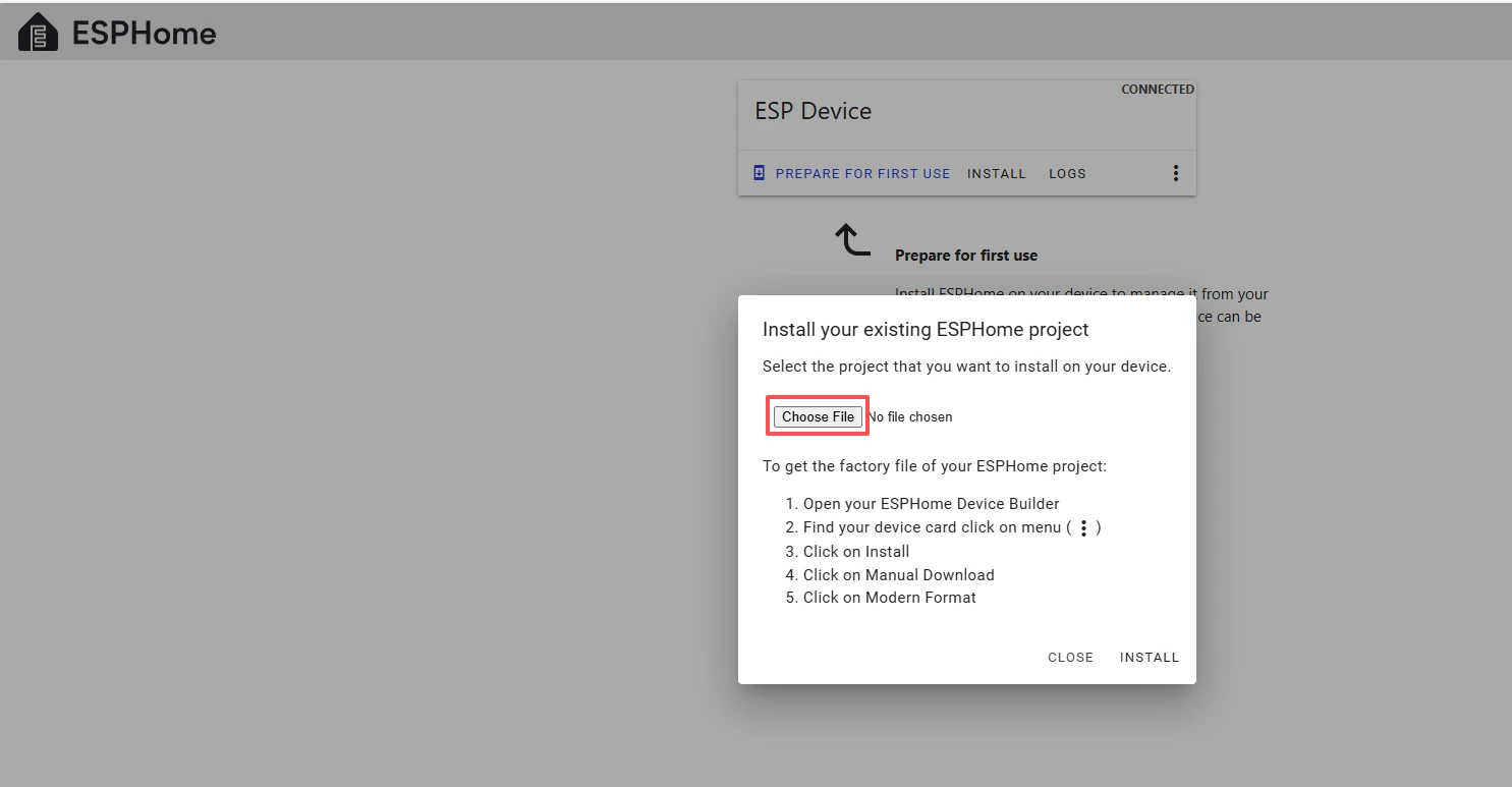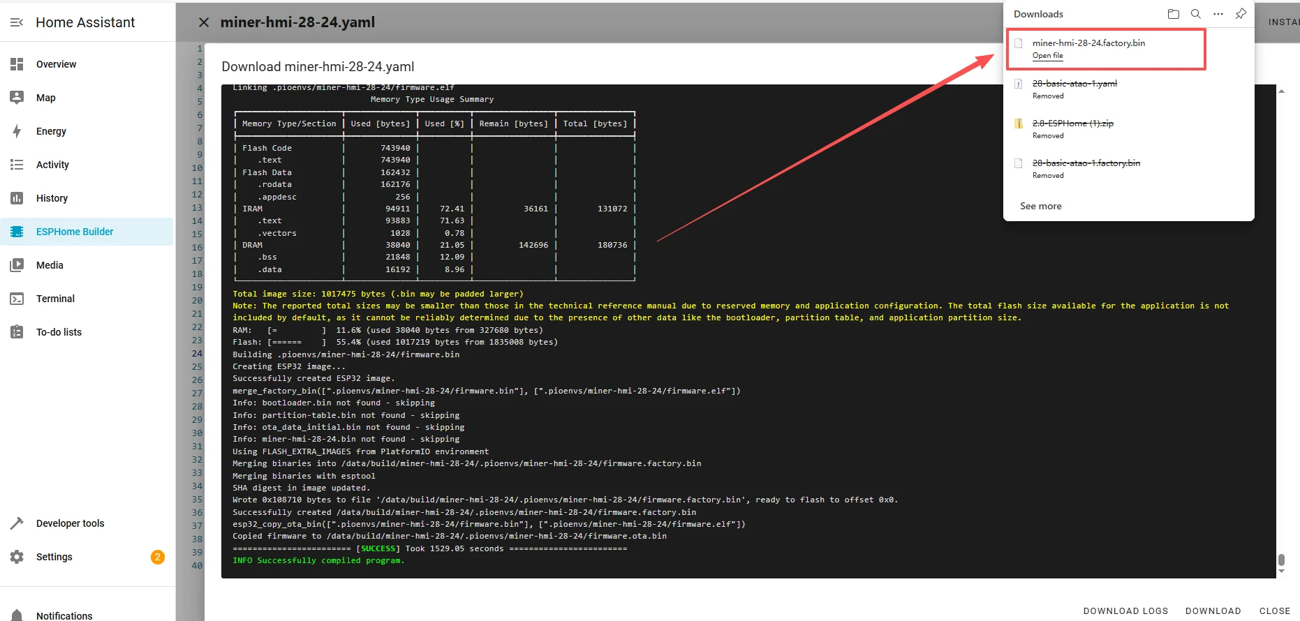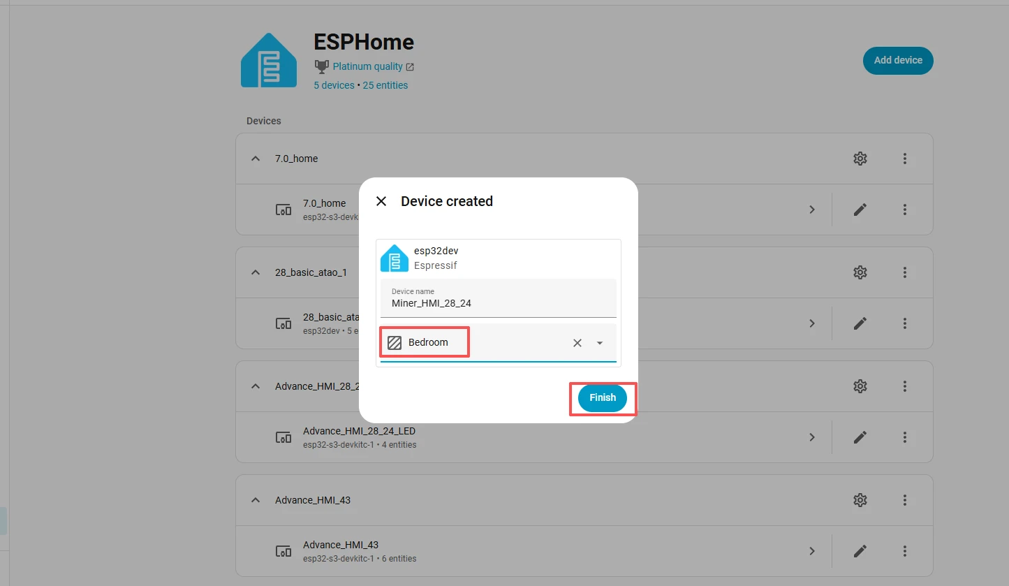 After successfully flashing the .bin file, return to the ESPHome page in Home Assistant.