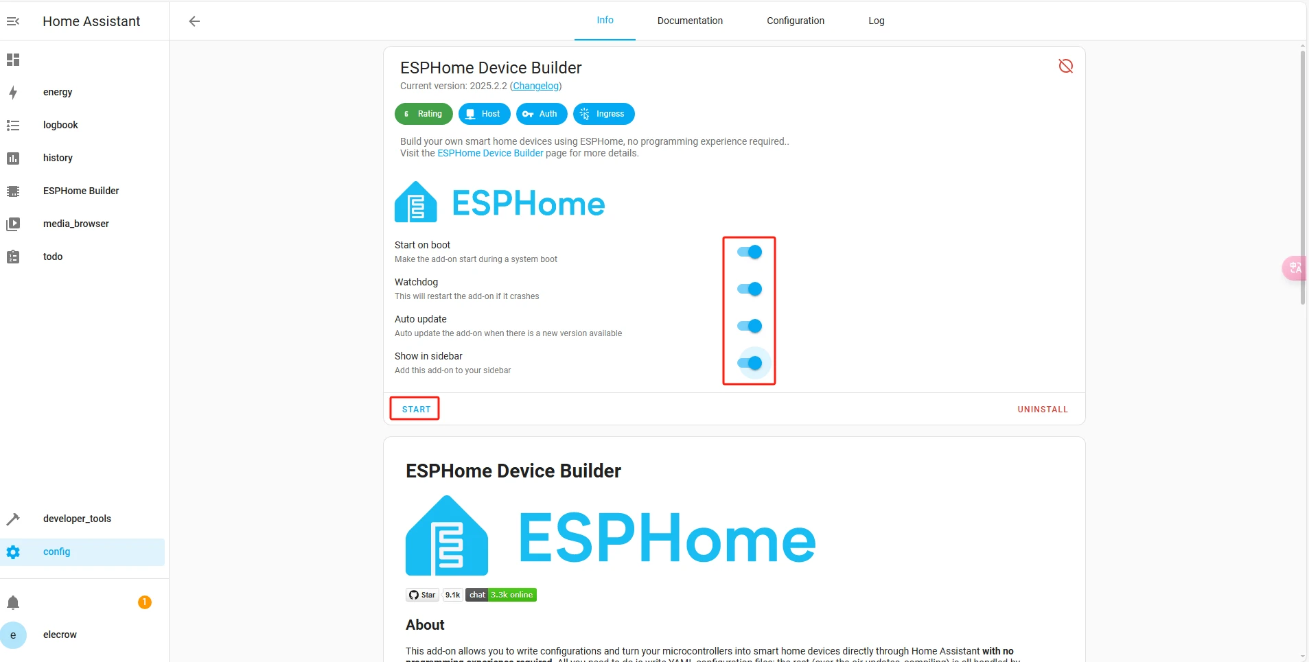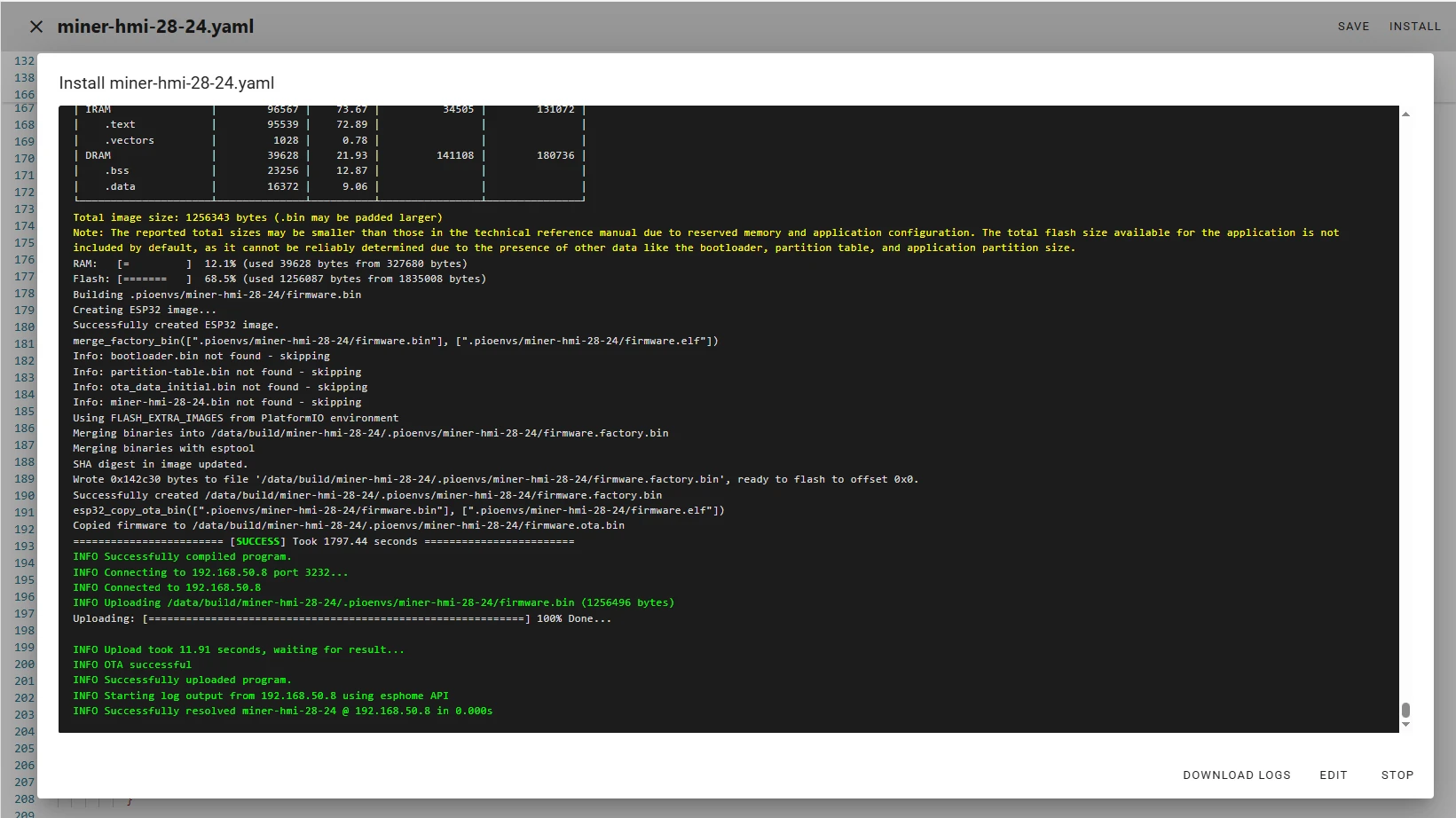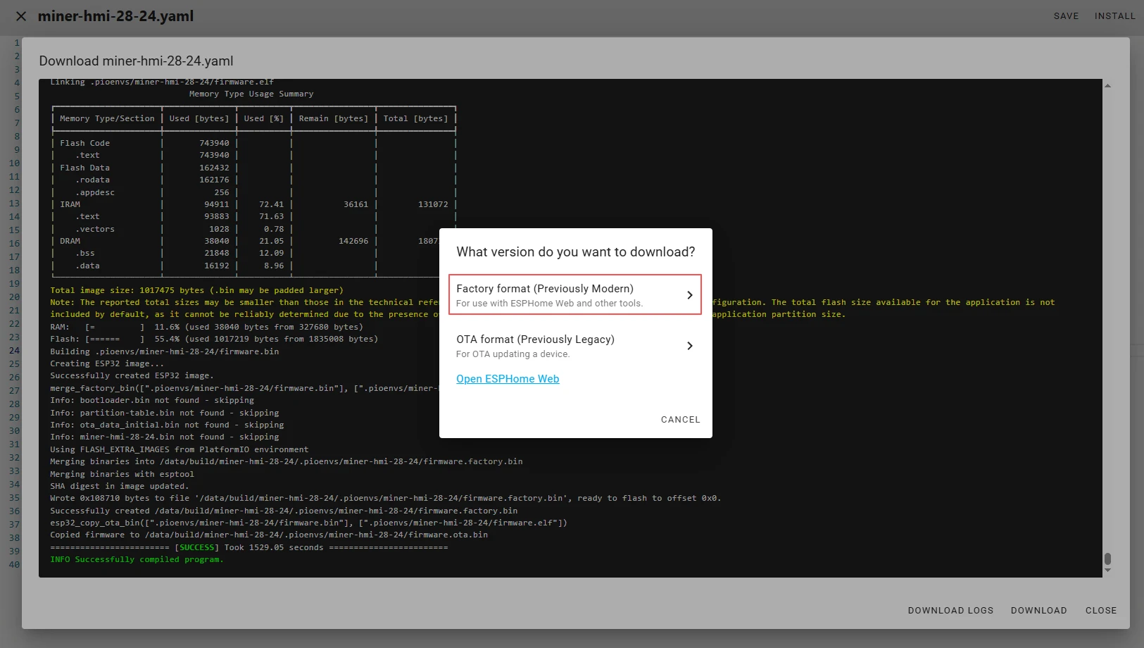 After successfully flashing the .bin file, return to the ESPHome page in Home Assistant.