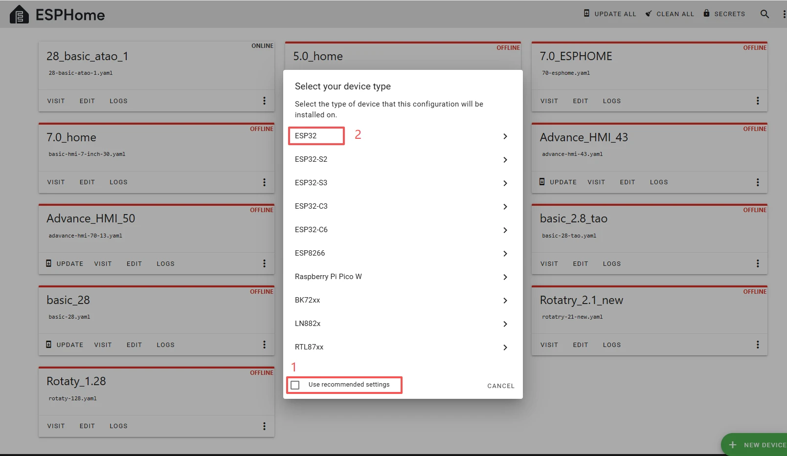 Here, do not check "Use recommended settings."Select the main chip of the Crowpanel ESP32 Miner HMI Display,ESP32.
