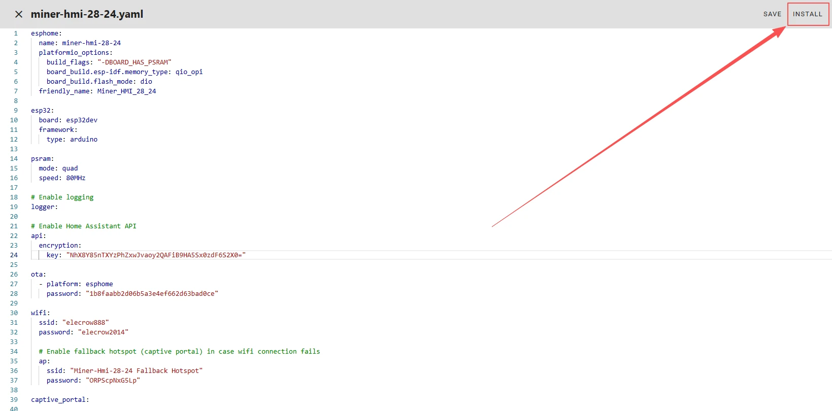 After connecting the Crowpanel ESP32 Miner HMI Display, click "Install".