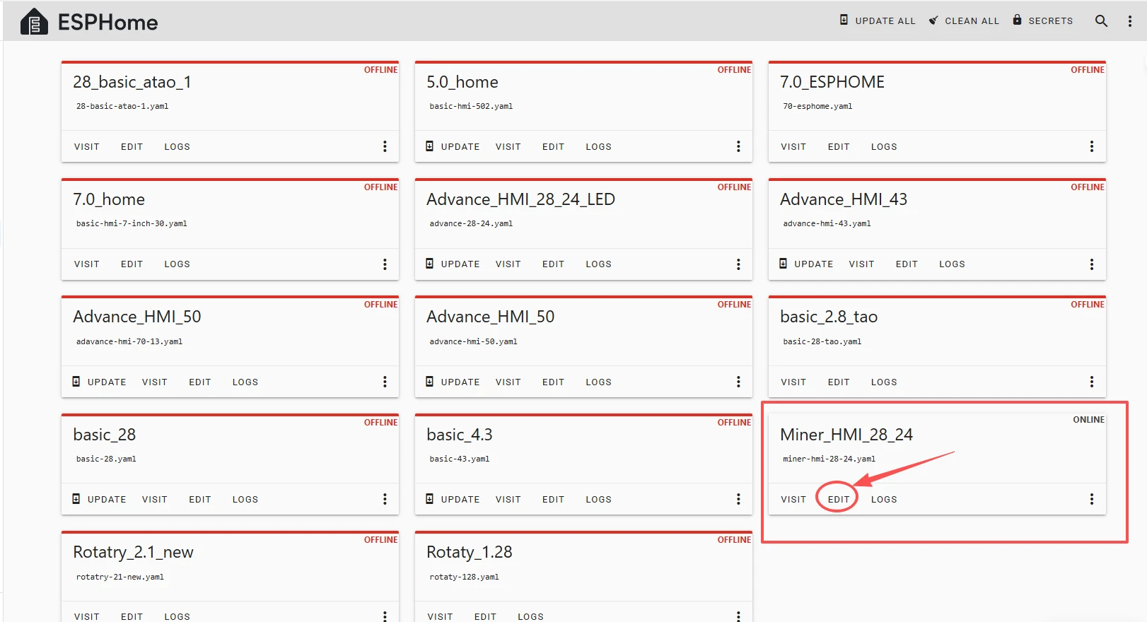Then, return to the main interface, find the Miner_HMI_28_24 you just created, click "EDIT", and enter the code editor.