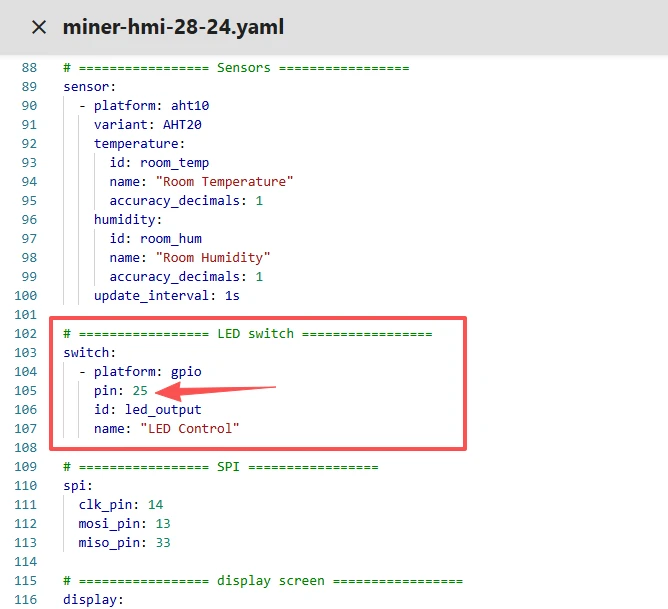 Here,pin:25 corresponds to the GPIO_D of the Crowpanel ESP32 Miner HMI Display that you have connected.