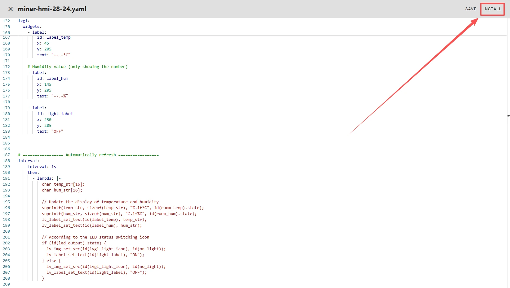 Once the code replacement is complete, click "INSTALL" in the top right corner.