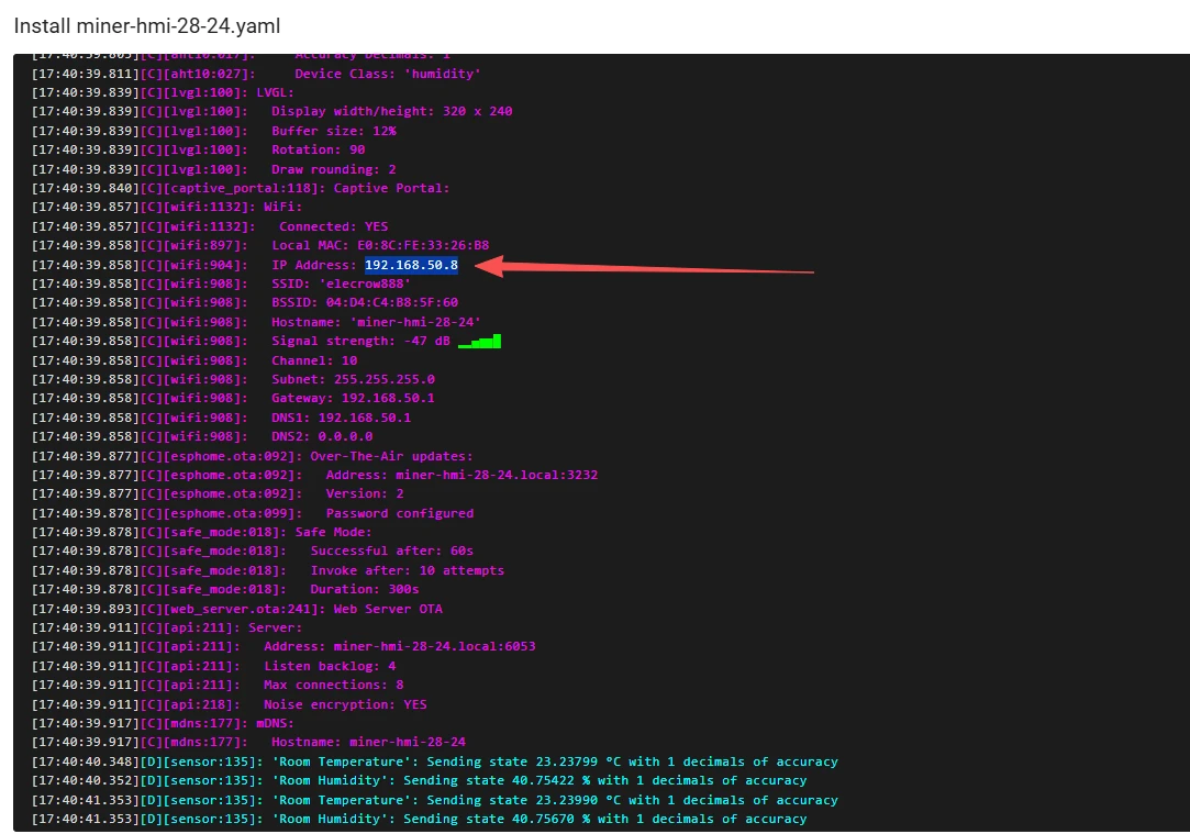 Scroll the mouse wheel to view the IP address of the Crowpanel ESP32 Miner HMI Display and make sure to remember it.
