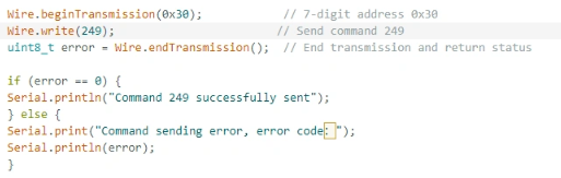 • sendI2CCommand(0) means sending command 0 to the microcontroller (address 0x30) to instruct it to set the screen brightness to maximum.