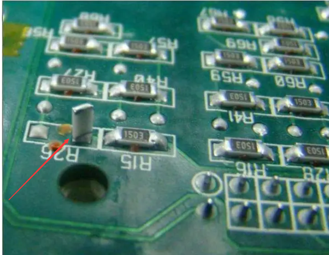 Defect 1:the phenomenon of "erecting stele" (i.e. chip components "erecting") [defect explanation] it is usually due to the unbalanced wetting force at both ends of the component during reflow soldering, resulting in unbalanced torque at both ends of the component, resulting in "erecting stele".