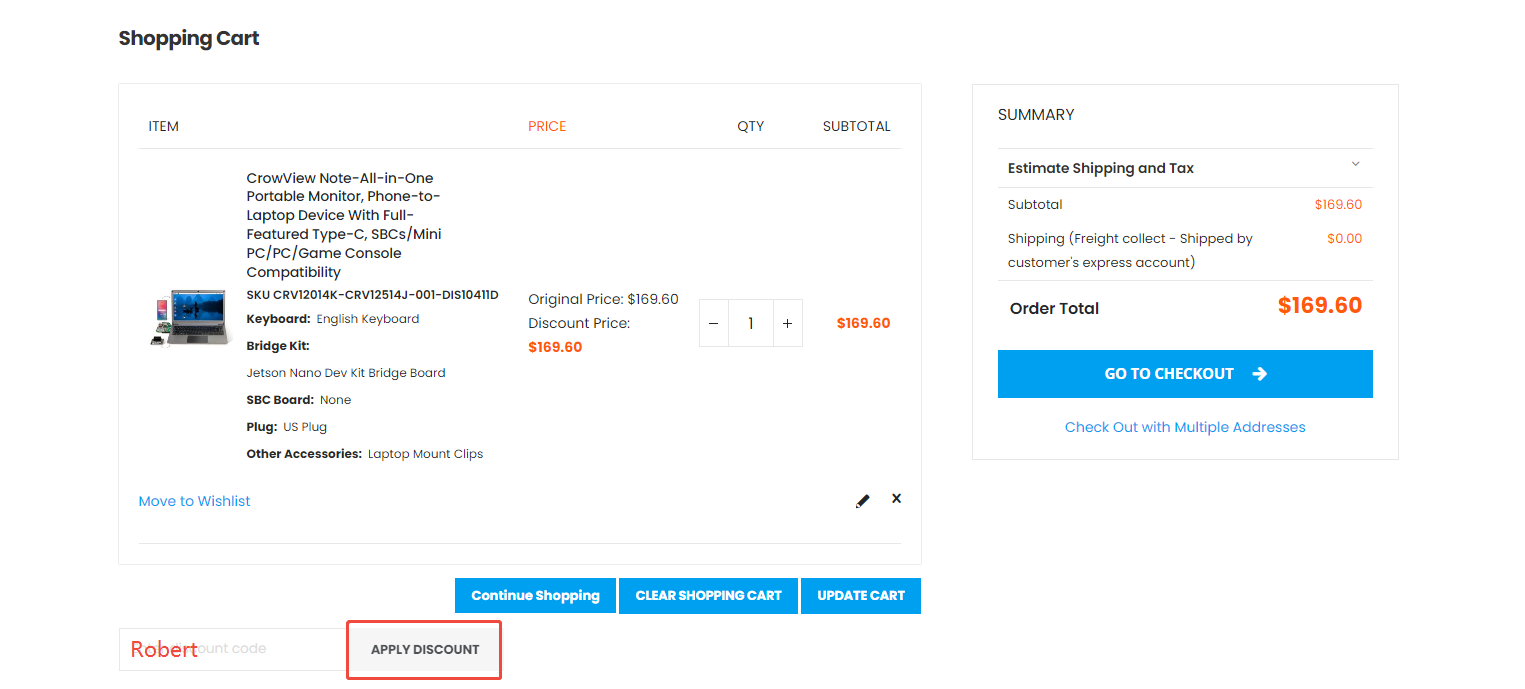 View our 'CrowView Note' product — 'Add to cart' — Check your 'Shopping Cart' — Enter Code 'Robert' — Successfully get 15% OFF!