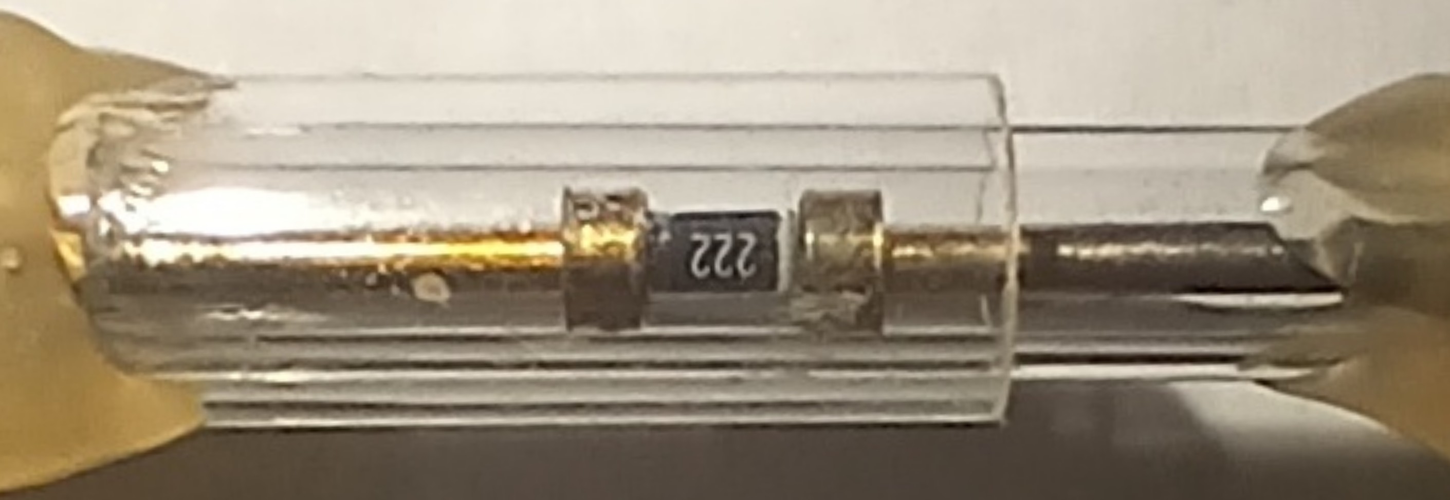 I made a jig for easily measuring Minimelf packages. The glass tubes were taken from incandescent light bulbs. I also used SMA connectors (male and female) and spring test probes. I attached the tubes to the SMA connector and the spring test probe using epoxy resin. I could have skipped the connectors and soldered the cables directly, but I was worried that the cable might break one day.