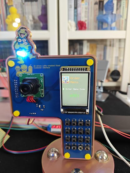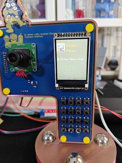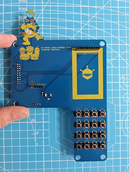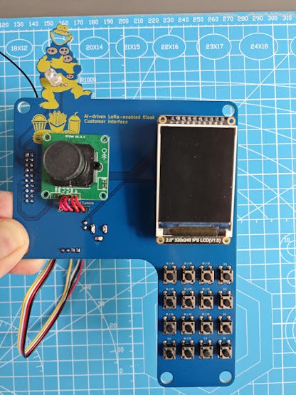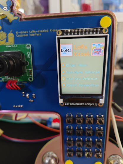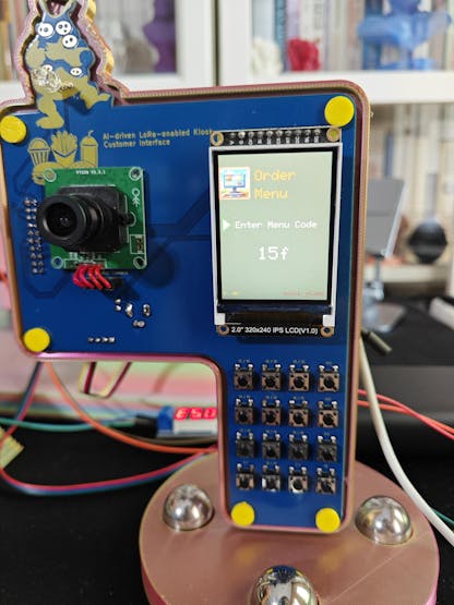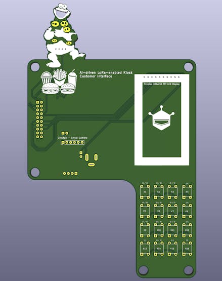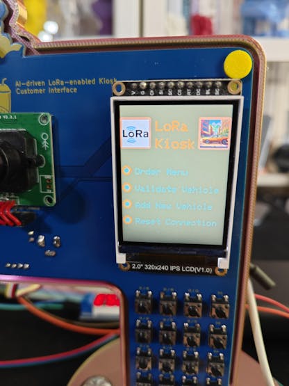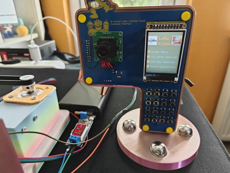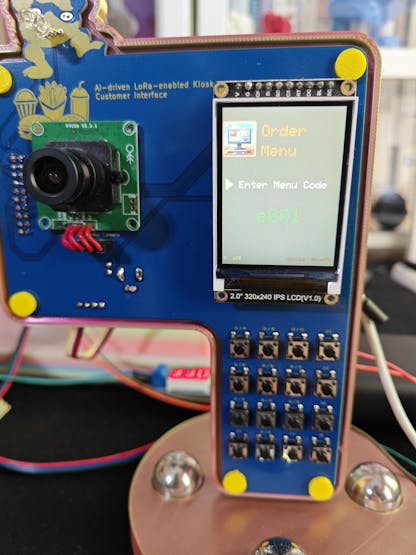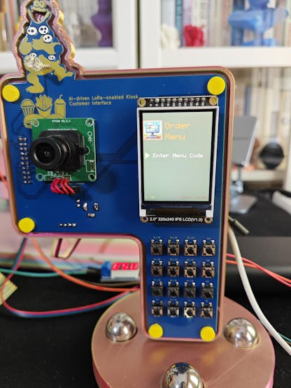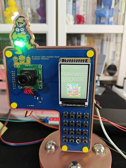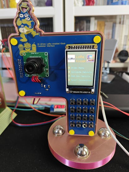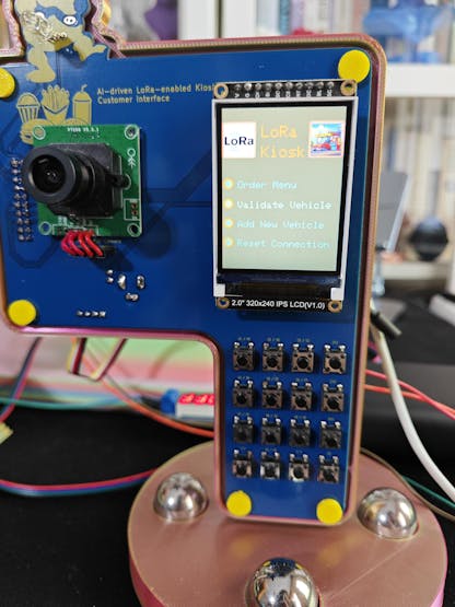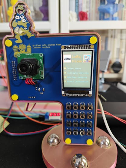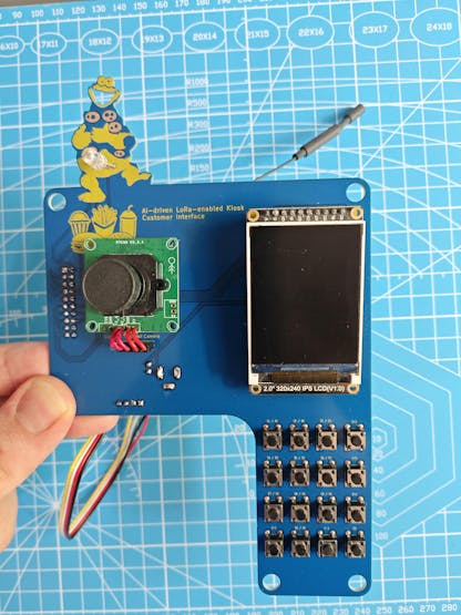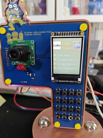 Then, I started to develop the kiosk customer endpoint, which handles customer-to-kiosk interactions and AI-based vehicle identification. As discussed, I decided to utilize LoRaWAN to establish the workflow between the endpoint and the restaurant web application. Thus, I based the customer endpoint design on the budget-friendly and feature-rich RA-08H LoRaWAN node board. Of course, the kiosk customer endpoint would not be complete without a dedicated LoRaWAN gateway transferring data packets to the web application with optimized configurations. Thus, I decided to utilize the LR1302 LoRaWAN gateway module and its Raspberry Pi-compatible hat. Also, I designed a unique PCB for the kiosk customer endpoint to build a compact and user-friendly device.