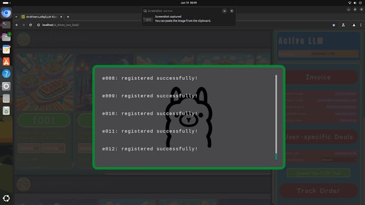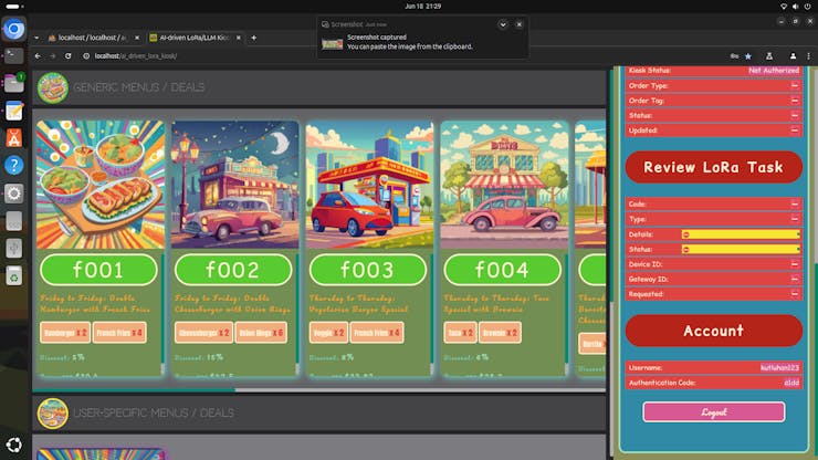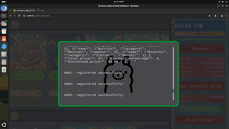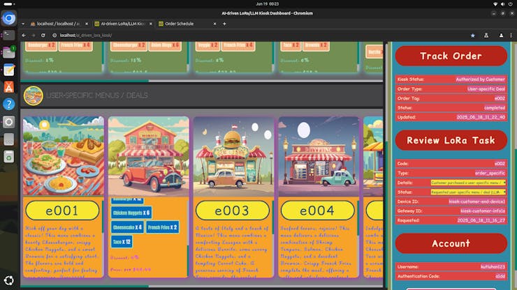 🍔 🚗 🛎️ 📶 Subsequently, the kiosk endpoint notifies customers of the success of the LoRaWAN data packet transmission on the screen. If successful, the endpoint suggests opening the restaurant web application's dashboard to track the order status.