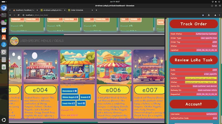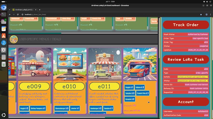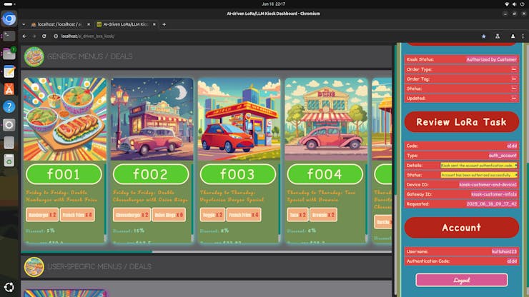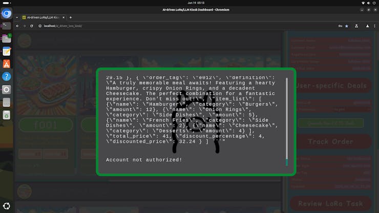 🍔 🚗 🛎️ 📶 Once the restaurant web application receives the correct authentication key, it authorizes the current customer's user account to enable user-specific menu/deal generation with the available large language models (LLMs). After authorizing the given account successfully, the web application notifies the customer under the Track Order section of the web dashboard.