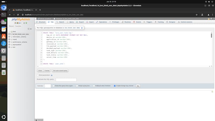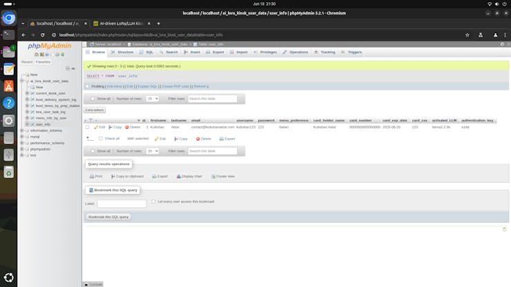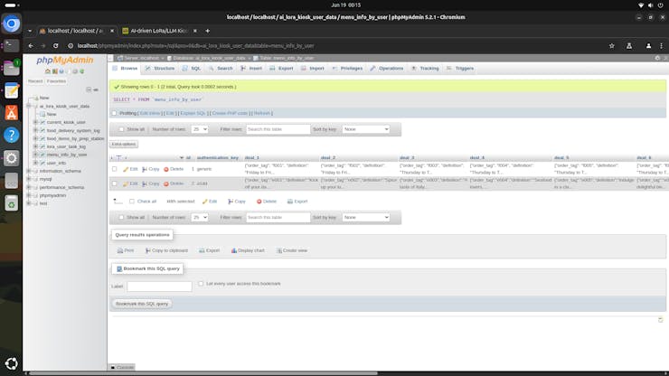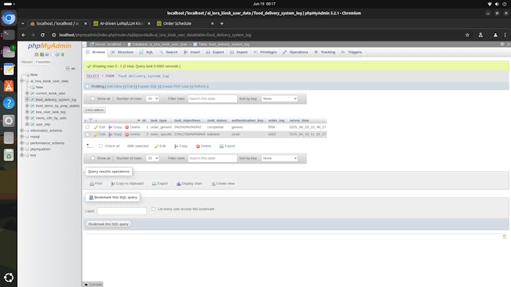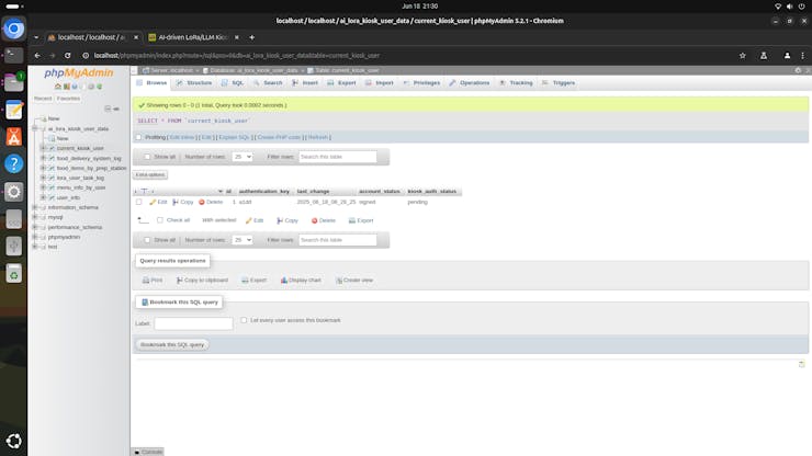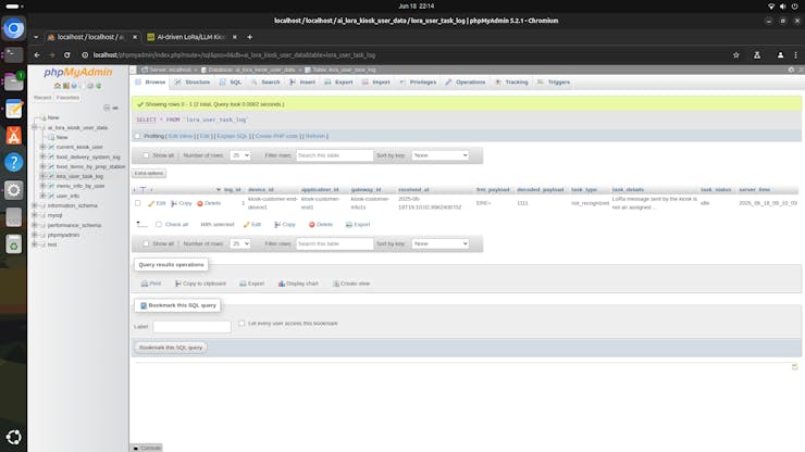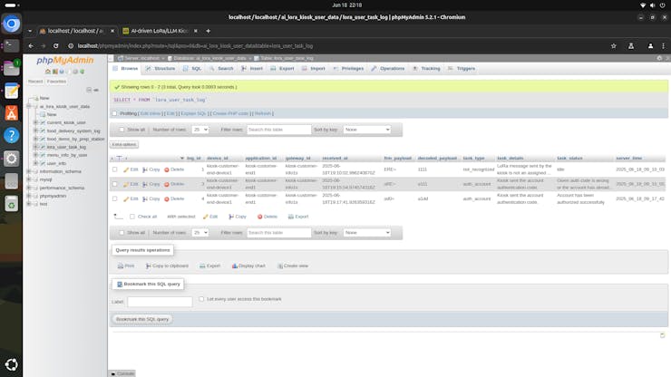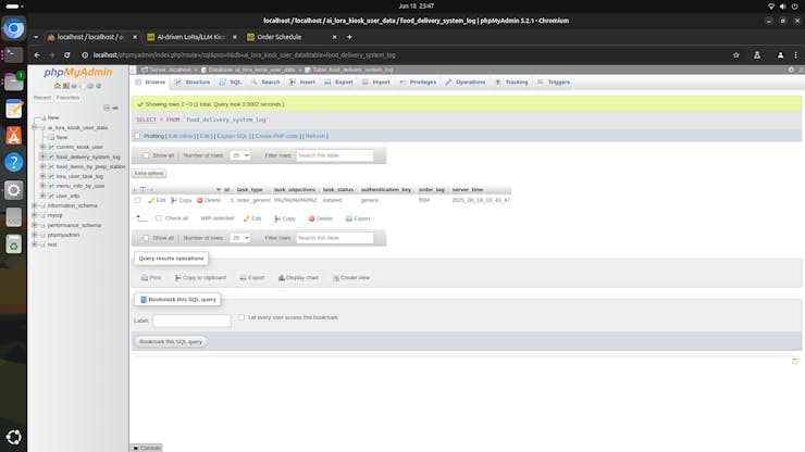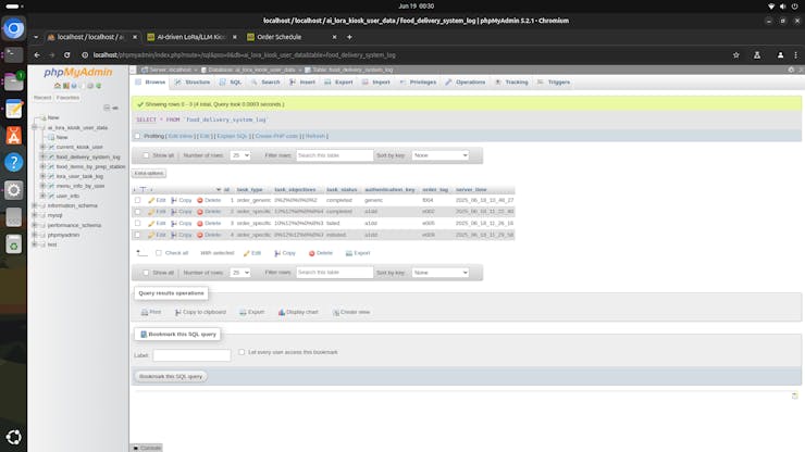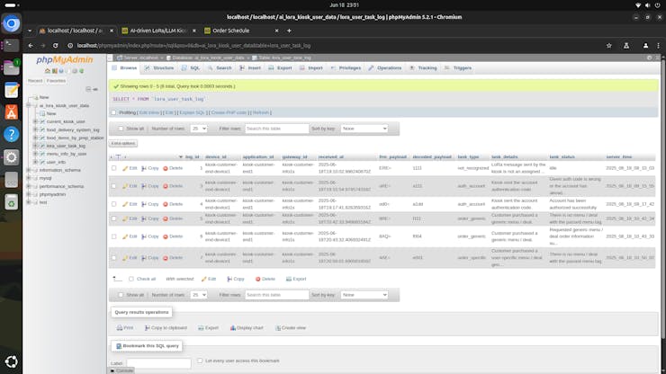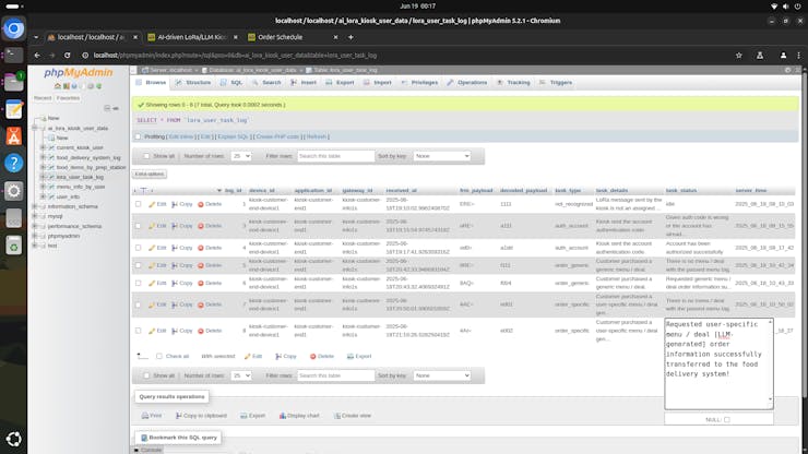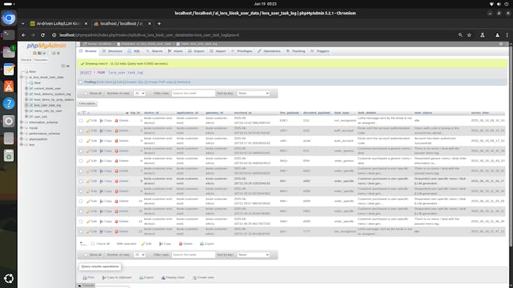 🍔 🚗 🛎️ 📶 Since the restaurant web application registers LoRa-transmitted task logs and the current dashboard/kiosk user information in the associated MariaDB database tables, it displays immaculate restaurant operation details on the web dashboard, applying the server's local time.