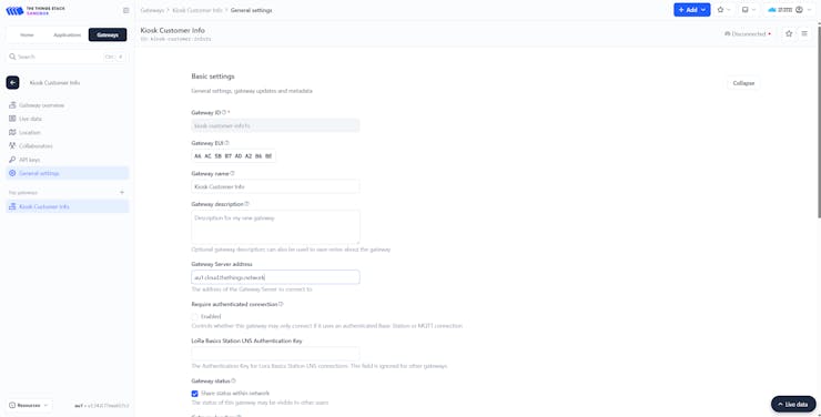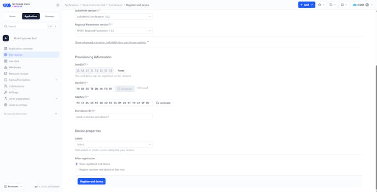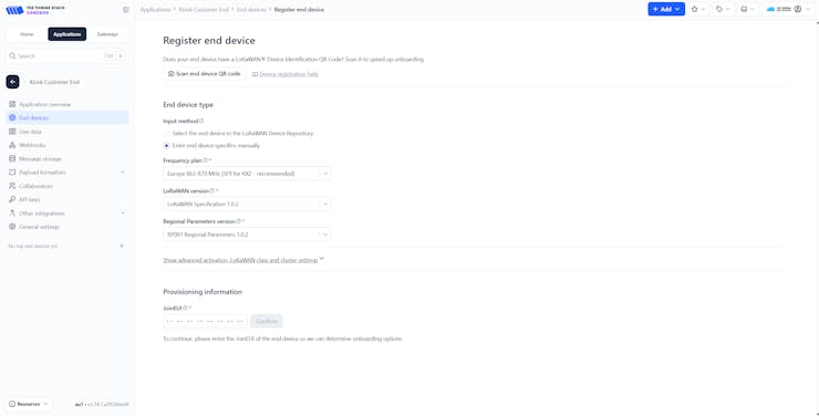 🍔 🚗 🛎️ 📶 In this regard, once the Reset Connection endpoint interface option is activated, the kiosk endpoint allows customers to reset the LoRaWAN gateway connection by pressing the '+' (ACTIVATE) keycap, according to the provided TTN-registered end device information — DEVEUI, JOINEUI (formerly called APPEUI), and APPKEY.