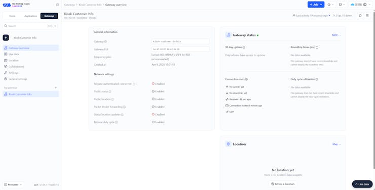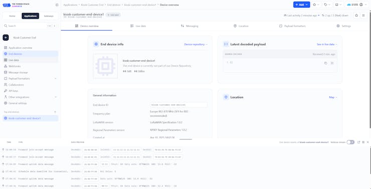 ✅ Establishing the LoRaWAN data transfer procedure between the kiosk customer endpoint and The Things Network via the dedicated LoRaWAN gateway.