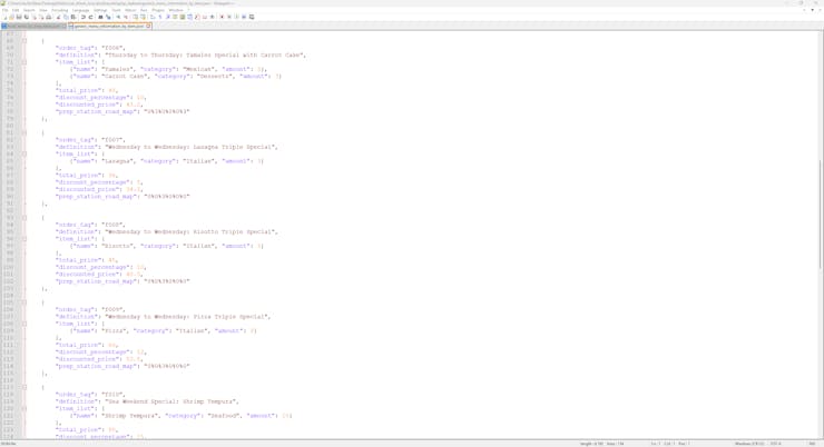LLM Response: "```json [ { \"order_tag\": \"e001\", \"definition\": \"A classic burger menu with a touch of international flair.\", \"item_list\": [ {\"name\": \"Hamburger\", \"category\": \"Burgers\", \"amount\": 2}, {\"name\": \"Taco\", \"category\": \"Mexican\", \"amount\": 3}, {\"name\": \"French Fries\", \"category\": \"Side Dishes\", \"amount\": 4} ], \"total_price\": 28, \"discount_percentage\": 5.0, \"discounted_price\": 26.6 }, { \"order_tag\": \"e002\", \"definition\": \"A fusion menu combining Italian and Mexican flavors for a unique dining experience.\", \"item_list\": [ {\"name\": \"Cheeseburger\", \"category\": \"Burgers\", \"amount\": 3}, {\"name\": \"Burrito\", \"category\": \"Mexican\", \"amount\": 4}, {\"name\": \"Chicken Nuggets\", \"category\": \"Side Dishes\", \"amount\": 5} ], \"total_price\": 41, \"discount_percentage\": 8.0, \"discounted_price\": 37.68 }, { \"order_tag\": \"e003\", \"definition\": \"An all-American feast with some mexican-inspired side dishes.\", \"item_list\": [ {\"name\": \"Veggie\", \"category\": \"Burgers\", \"amount\": 2}, {\"name\": \"Tamales\", \"category\": \"Mexican\", \"amount\": 3}, {\"name\": \"Brownie\", \"category\": \"Desserts\", \"amount\": 4} ], \"total_price\": 39, \"discount_percentage\": 7.0, \"discounted_price\": 36.15 }, { \"order_tag\": \"e004\", \"definition\": \"A balanced menu with a variety of proteins from different cuisines.\", \"item_list\": [ {\"name\": \"Hamburger\", \"category\": \"Burgers\", \"amount\": 3}, {\"name\": \"Taco\", \"category\": \"Mexican\", \"amount\": 4}, {\"name\": \"Onion Rings\", \"category\": \"Side Dishes\", \"amount\": 5} ], \"total_price\": 46, \"discount_percentage\": 9.0, \"discounted_price\": 41.74 }, { \"order_tag\": \"e005\", \"definition\": \"A spicy and savory menu perfect for a hot day.\", \"item_list\": [ {\"name\": \"Cheeseburger\", \"category\": \"Burgers\", \"amount\": 2}, {\"name\": \"Burrito\", \"category\": \"Mexican\", \"amount\": 4}, {\"name\": \"Chicken Nuggets\", \"category\": \"Side Dishes\", \"amount\": 3} ], \"total_price\": 39, \"discount_percentage\": 10.0, \"discounted_price\": 35.1 }, { \"order_tag\": \"e006\", \"definition\": \"A hearty and satisfying meal with some sweet treats to round it out.\", \"item_list\": [ {\"name\": \"Veggie\", \"category\": \"Burgers\", \"amount\": 4}, {\"name\": \"Tamales\", \"category\": \"Mexican\", \"amount\": 3}, {\"name\": \"French Fries\", \"category\": \"Side Dishes\", \"amount\": 2} ], \"total_price\": 41, \"discount_percentage\": 8.0, \"discounted_price\": 37.68 }, { \"order_tag\": \"e007\", \"definition\": \"A Mediterranean-inspired menu with Mexican flair.\", \"item_list\": [ {\"name\": \"Hamburger\", \"category\": \"Burgers\", \"amount\": 2}, {\"name\": \"Tamales\", \"category\": \"Mexican\", \"amount\": 3}, {\"name\": \"Pizza\", \"category\": \"Italian\", \"amount\": 4} ], \"total_price\": 50, \"discount_percentage\": 6.0, \"discounted_price\": 45 }, { \"order_tag\": \"e008\", \"definition\": \"A budget-friendly combo with a kick of flavor.\", \"item_list\": [ {\"name\": \"Cheeseburger\", \"category\": \"Burgers\", \"amount\": 3}, {\"name\": \"Taco\", \"category\": \"Mexican\", \"amount\": 4}, {\"name\": \"Onion Rings\", \"category\": \"Side Dishes\", \"amount\": 5} ], \"total_price\": 52, \"discount_percentage\": 7.0, \"discounted_price\": 48 }, { \"order_tag\": \"e009\", \"definition\": \"A flavor explosion with a side of cheesy goodness.\", \"item_list\": [ {\"name\": \"Veggie\", \"category\": \"Burgers\", \"amount\": 2}, {\"name\": \"Burrito\", \"category\": \"Mexican\", \"amount\": 4}, {\"name\": \"French Fries\", \"category\": \"Side Dishes\", \"amount\": 4} ], \"total_price\": 50, \"discount_percentage\": 9.0, \"discounted_price\": 45 }, { \"order_tag\": \"e010\", \"definition\": \"A classic fast-food experience with a healthy twist.\", \"item_list\": [ {\"name\": \"Hamburger\", \"category\": \"Burgers\", \"amount\": 3}, {\"name\": \"Tamales\", \"category\": \"Mexican\", \"amount\": 2}, {\"name\": \"Chicken Nuggets\", \"category\": \"Side Dishes\", \"amount\": 5} ], \"total_price\": 46, \"discount_percentage\": 8.0, \"discounted_price\": 42 }, { \"order_tag\": \"e011\", \"definition\": \"A spicy and sweet menu to satisfy all your cravings.\", \"item_list\": [ {\"name\": \"Cheeseburger\", \"category\": \"Burgers\", \"amount\": 3}, {\"name\": \"Taco\", \"category\": \"Mexican\", \"amount\": 4}, {\"name\": \"Carrot Cake\", \"category\": \"Desserts\", \"amount\": 2} ], \"total_price\": 47, \"discount_percentage\": 6.0, \"discounted_price\": 43 }, { \"order_tag\": \"e012\", \"definition\": \"A wholesome and delicious meal for everyone.\", \"item_list\": [ {\"name\": \"Veggie\", \"category\": \"Burgers\", \"amount\": 2}, {\"name\": \"Tamales\", \"category\": \"Mexican\", \"amount\": 3}, {\"name\": \"Pizza\", \"category\": \"Italian\", \"amount\": 4} ], \"total_price\": 50, \"discount_percentage\": 10.0, \"discounted_price\": 45 } ] ```"