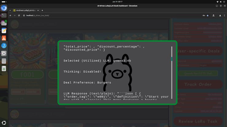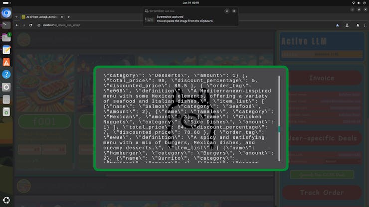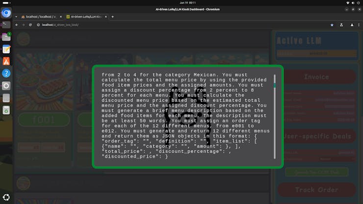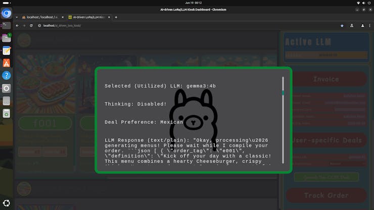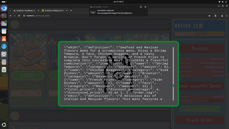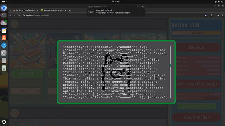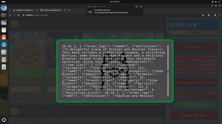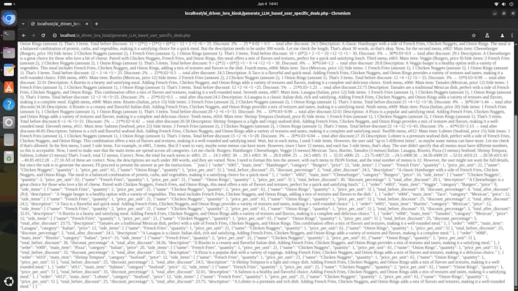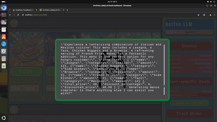 🍔 🚗 🛎️ 📶 After obtaining, processing, and decoding the LLM-generated text response successfully, the LLM interface shows a thorough report of the AI-assisted menu/deal generation process.