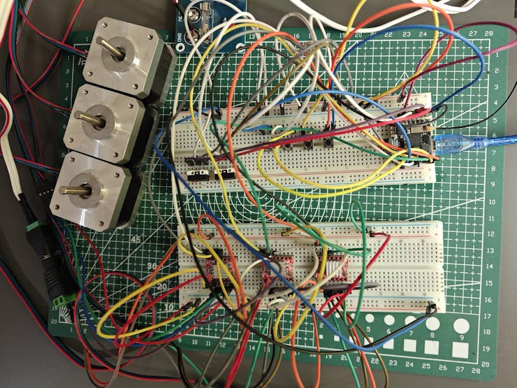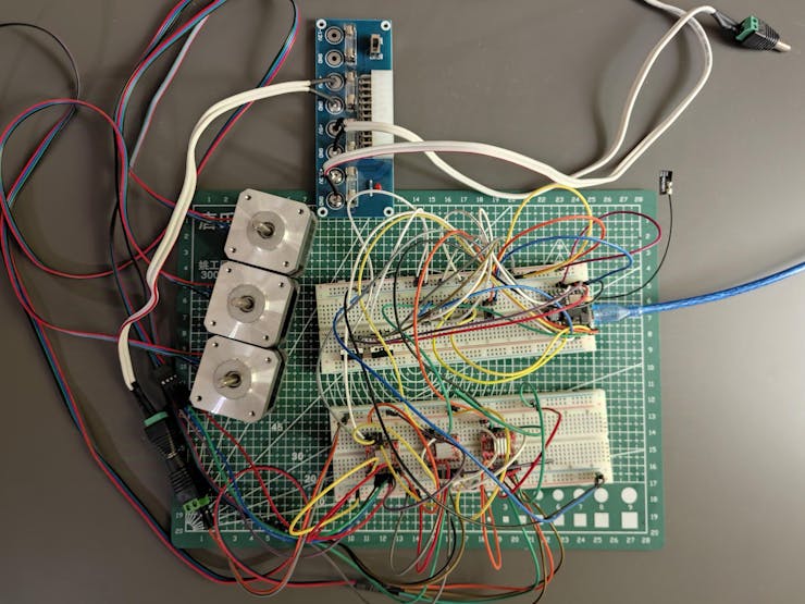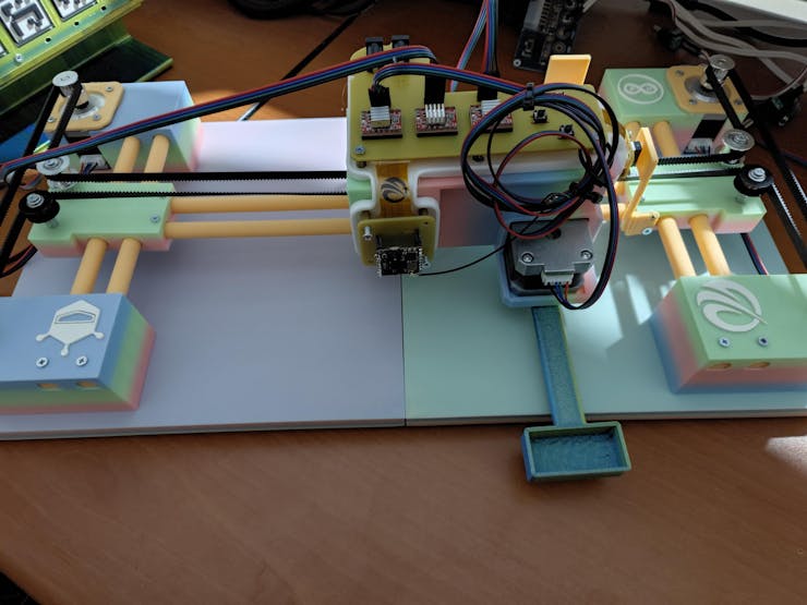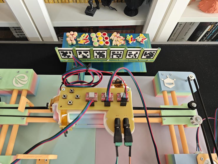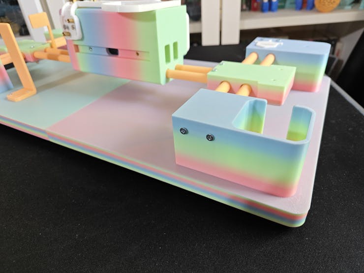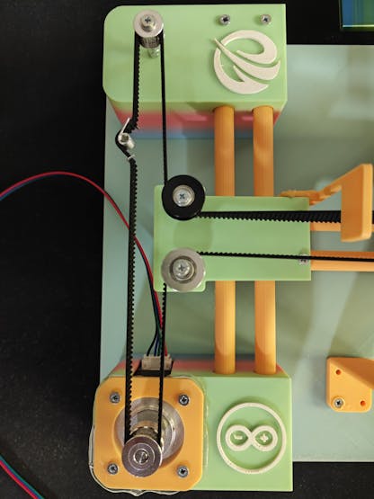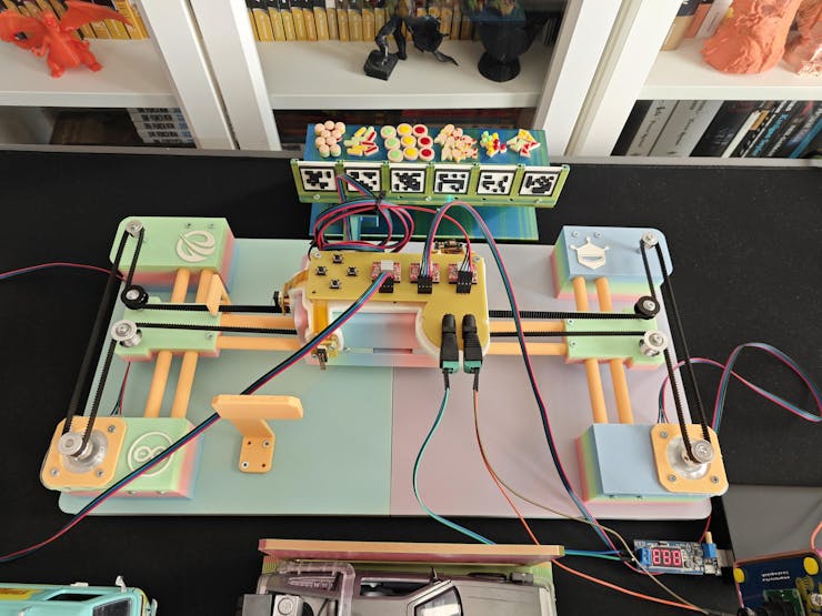 Finally, I started to develop the automatic food delivery system, which communicates with the web application to obtain the latest order information and collects the requested food items from the food prep stations to serve them to customers. After considering various design approaches, I decided to base my food delivery system on the H-Bot gantry mechanism, which is driven by a single GT2 timing belt and provides a high level of precision for simple sorting and conveyor transfer operations.
