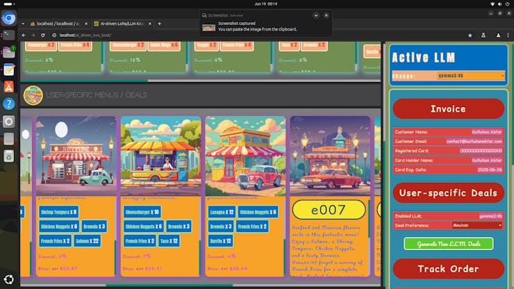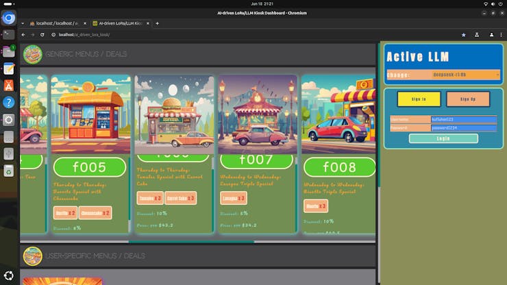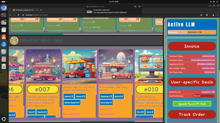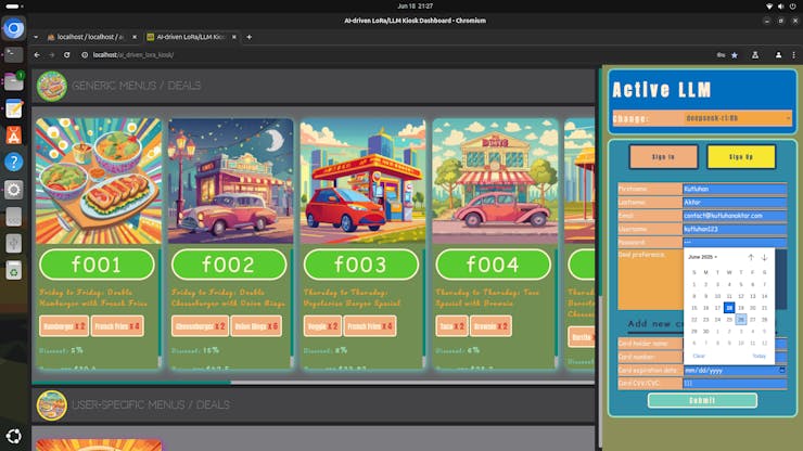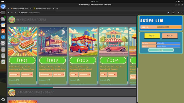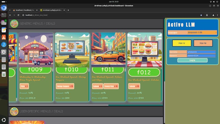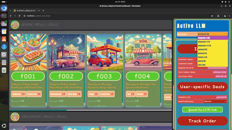 🍔 🚗 🛎️ 📶 Once the restaurant web application authorizes the current customer's user account, the web application enables user-specific menu/deal generation and allows customers to select an available large language model (LLM) from the provided drop-down list.