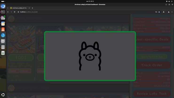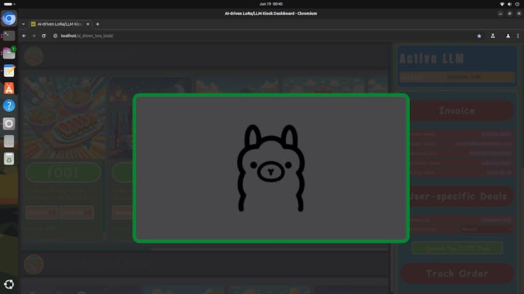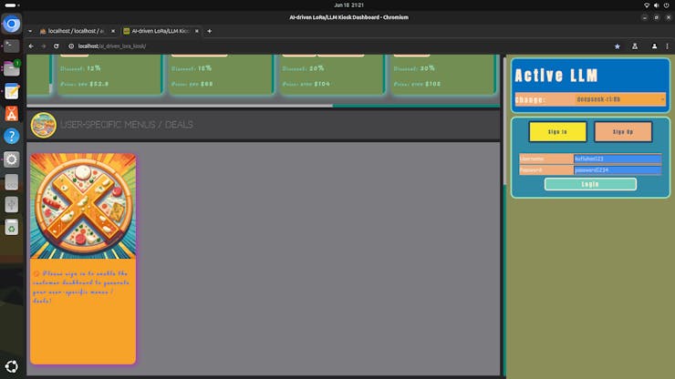 🍔 🚗 🛎️ 📶 Once the customer clicks the Generate New LLM Deals button under the User-specific Deals section of the web dashboard, the restaurant web application opens the large language model (LLM) interface as a nested browsing context on the web dashboard.