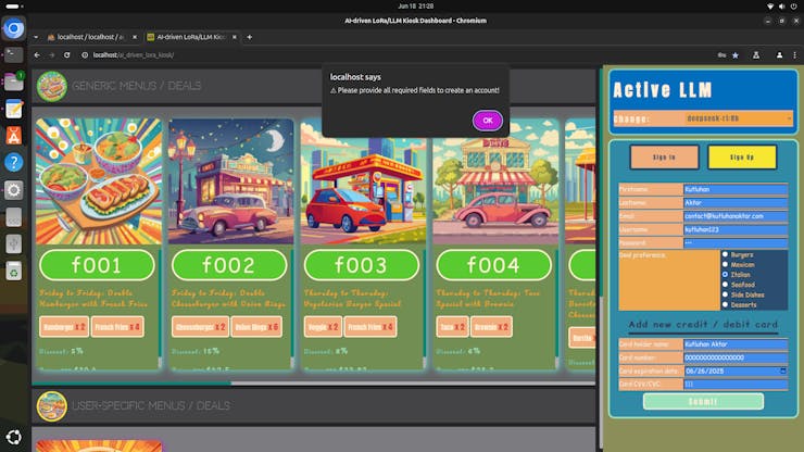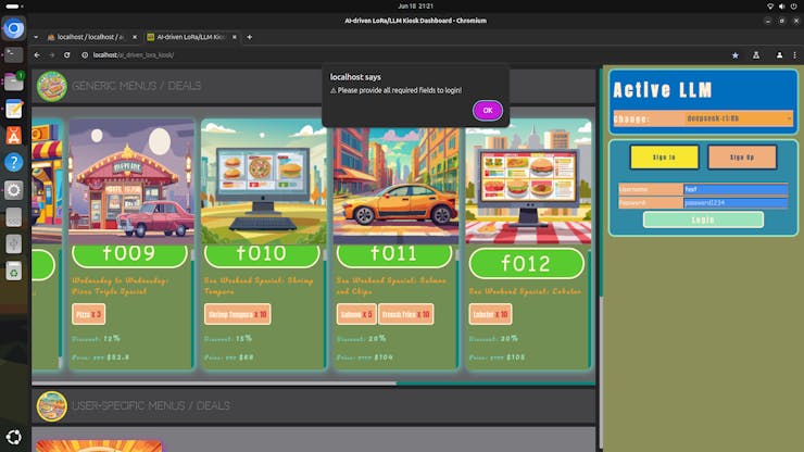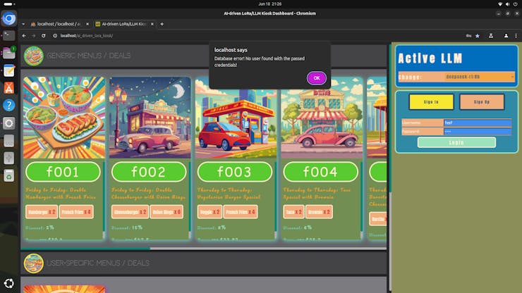 🍔 🚗 🛎️ 📶 Nevertheless, the web application does not process the retrieved LLM text response or save the produced user-specific menus/deals, and notifies customers to authorize their accounts to enable LLM-generated menus/deals.