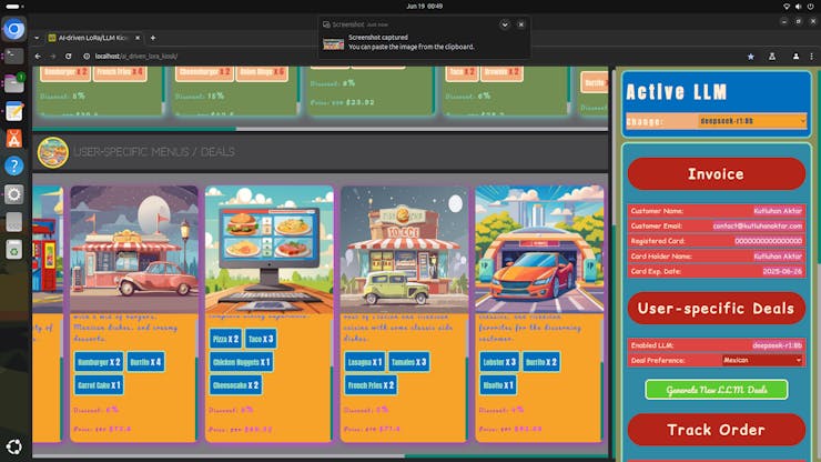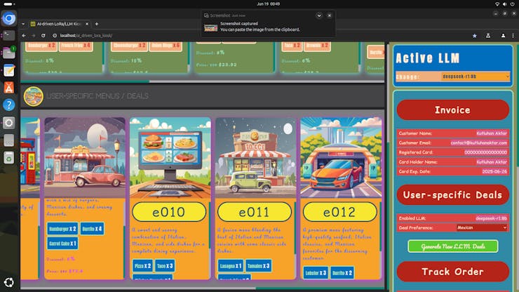 🍔 🚗 🛎️ 📶 Then, the web application runs the currently-selected large language model (LLM) locally via Ollama to generate user-specific menus/deals based on the provided customer information and deal preference.