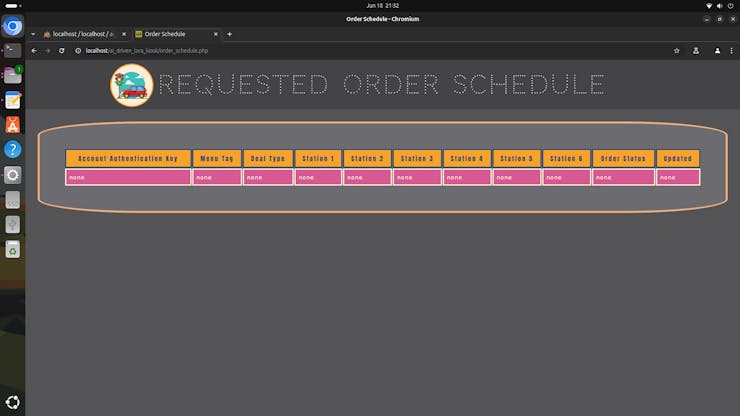 🍔 🚗 🛎️ 📶 Since the restaurant web application registers detailed food delivery system logs in the associated MariaDB database table, applying the server's local time, the web application is able to provide the restaurant workers and cooks with a real-time order schedule, showcasing thorough menu information and the required food item list per food prep station.
