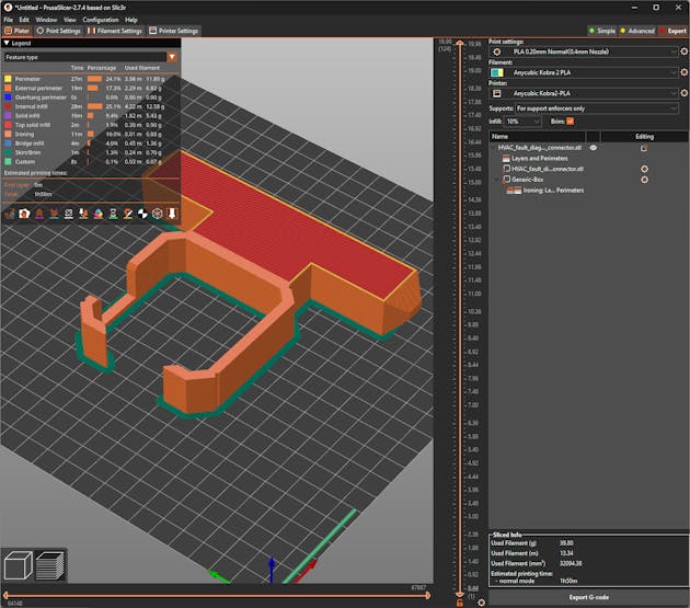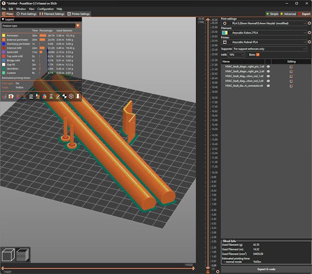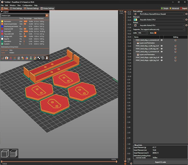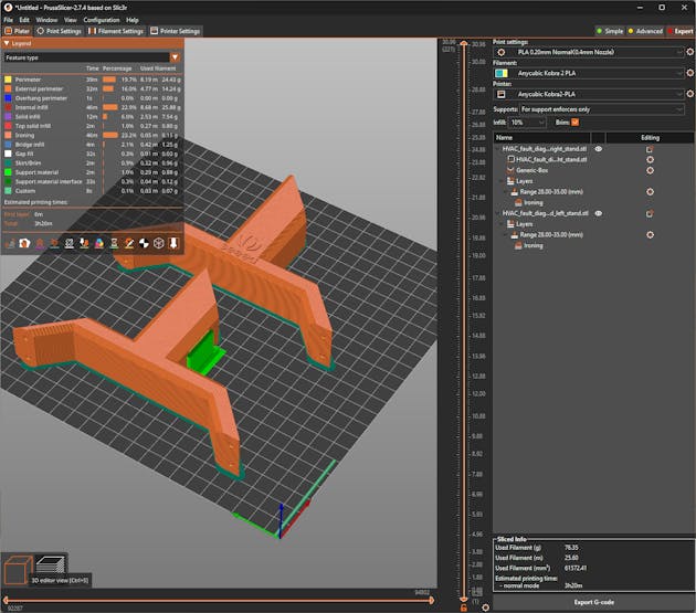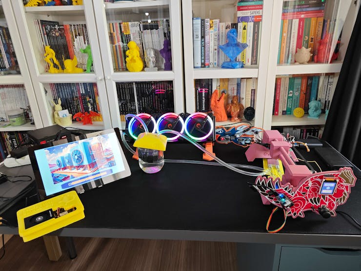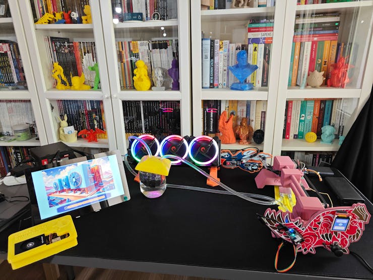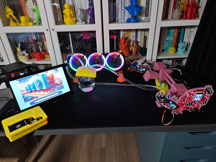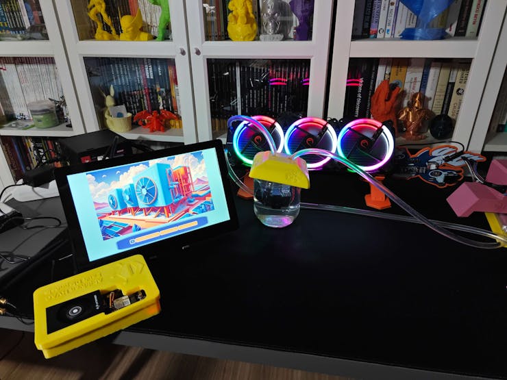 Finally, in addition to the custom CNC router and coolant reservoir parts, I designed a plethora of complementary 3D parts, from unique PCB encasements to radiator mounts, so as to make the device as robust and compact as possible. To print flexible parts handling water pressure, I utilized a color-changing TPU filament.