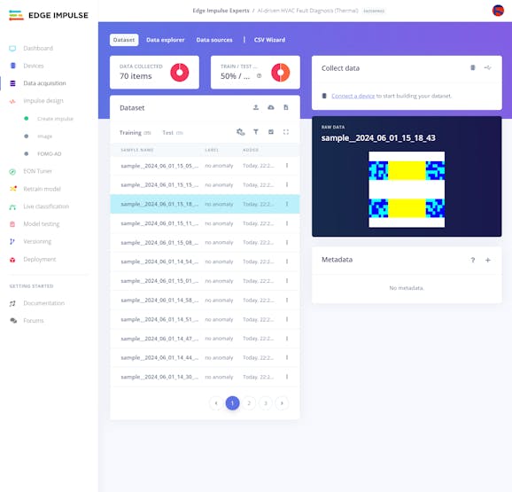 As mentioned earlier, to provide full-fledged AIoT features with seamless integration and simplify complex data transfer procedures between development boards while constructing separate data sets and running multiple models, I decided to develop a versatile web application (dashboard) from scratch. To briefly summarize, the web dashboard can receive audio buffers via HTTP POST requests, save audio samples by given classes, communicate with the Particle Cloud to obtain variables or make Particle boards register them, produce thermal images from thermal imaging buffers to store image samples, and run the visual anomaly detection model on the generated thermal images. In the following tutorial, you can inspect all web dashboard features in detail.