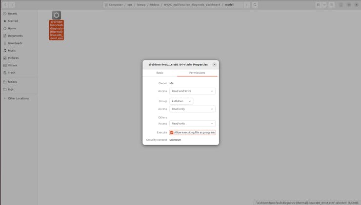 #️⃣ After downloading the generated Linux (x86_64) application to the model folder under the root folder of the web application, make sure to change the file permissions via the Properties tab to be able to execute the model file. As shown earlier, you can also use the terminal (shell) to change file permissions.