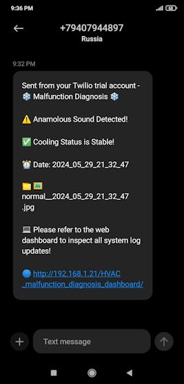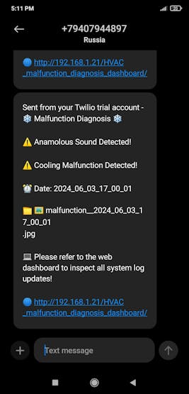 ⚠️🔊♨️🖼️ Finally, the web application sends an SMS via Twilio to inform the user of anomalous sound detection and the status of the ensuing thermal cooling malfunctions of HVAC system components.